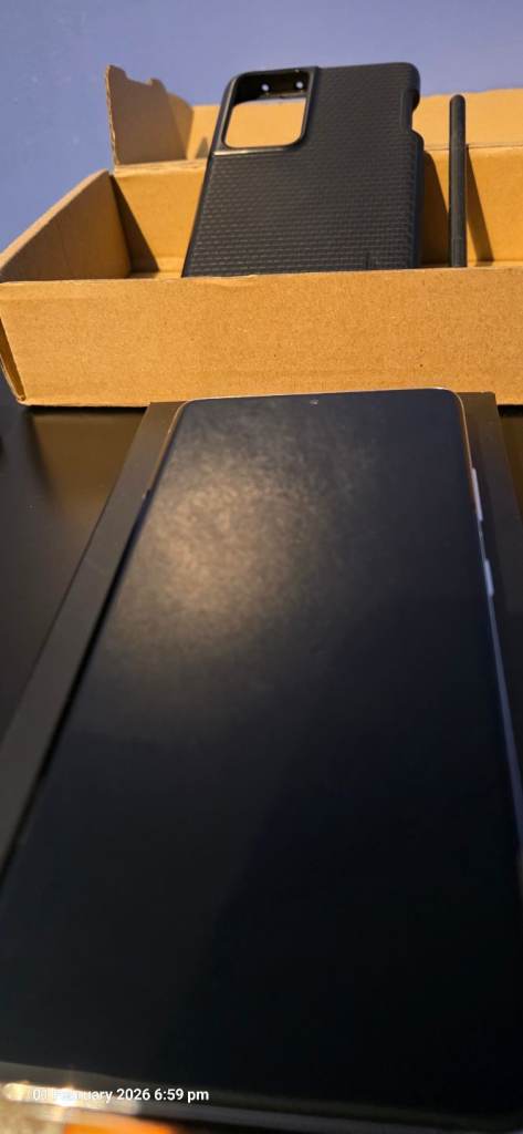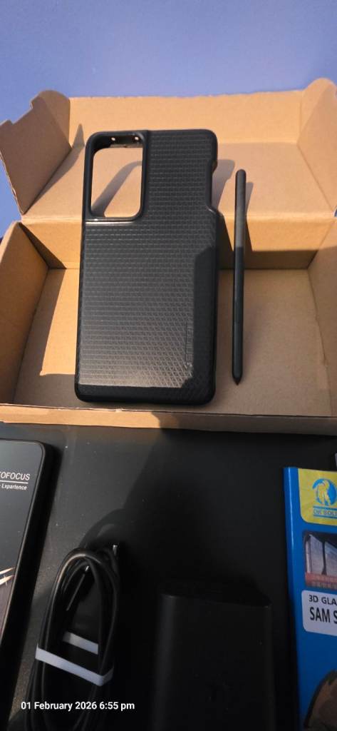 128 Gb of memory, 12 ram. Comes with new screen protector, Lens protector, 1 cases, 1 pen case and with full Samsung size pen. Fast charger, lead.