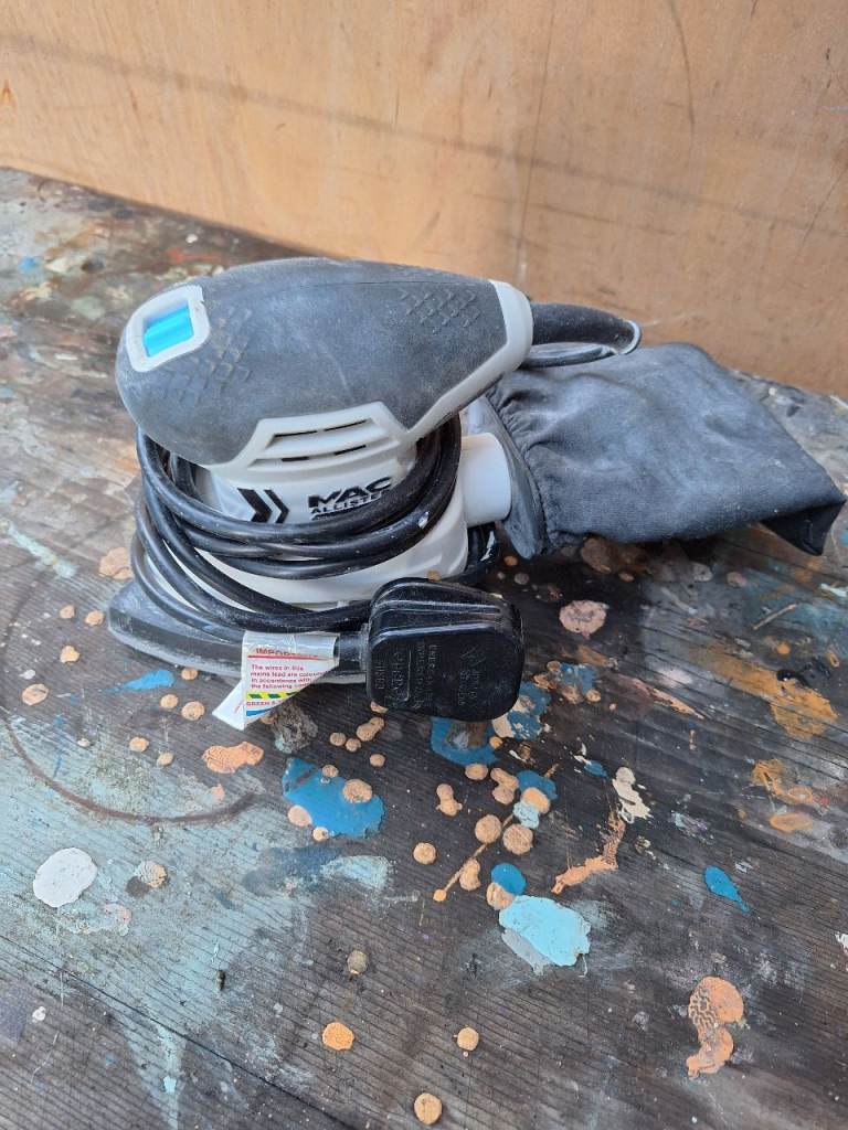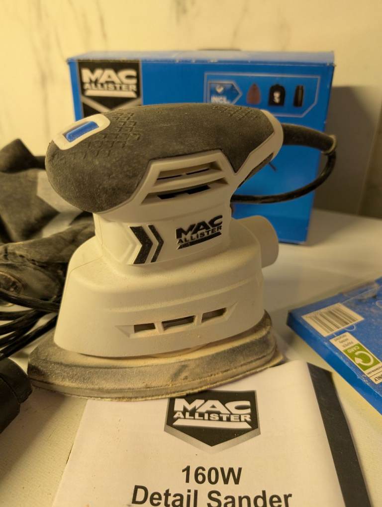 Mac Allister 160W detail sander with almost a full pack of sheets.