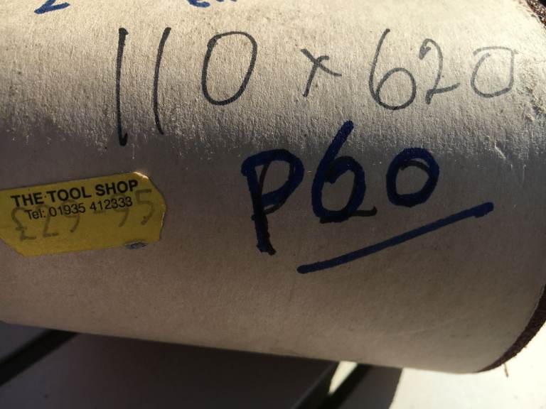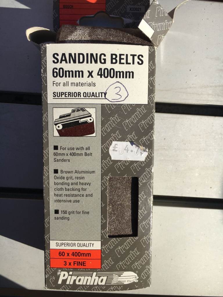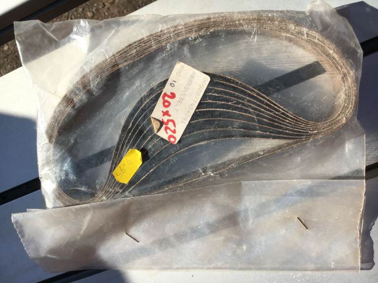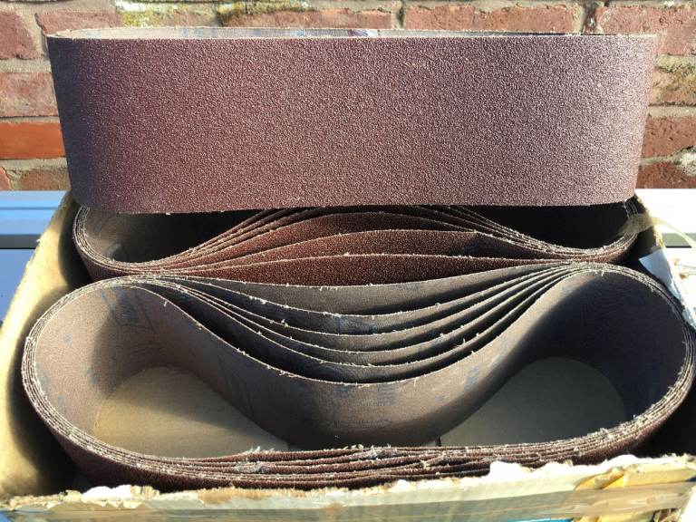 Box of mixed unused various sizes of sanding belts / sandpaper. most of sizes on pics. but