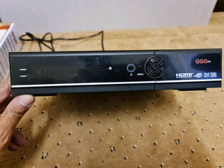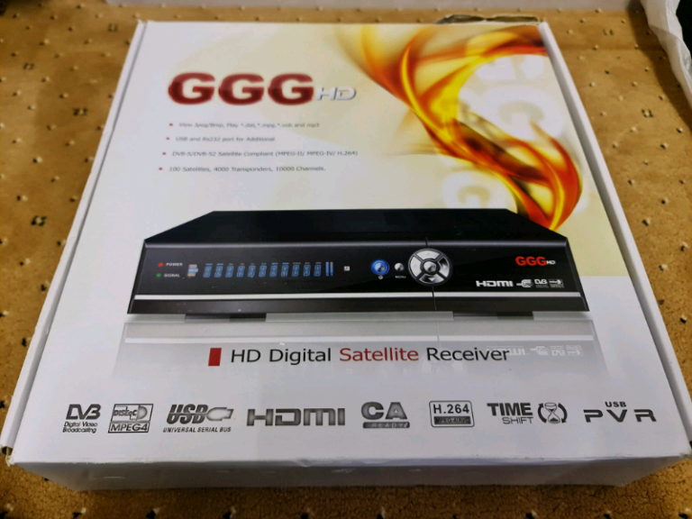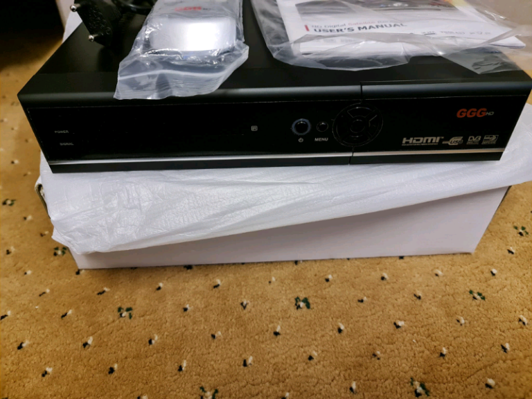 new condition GGGHD digital satellite box with its original box and remote/ accessories.