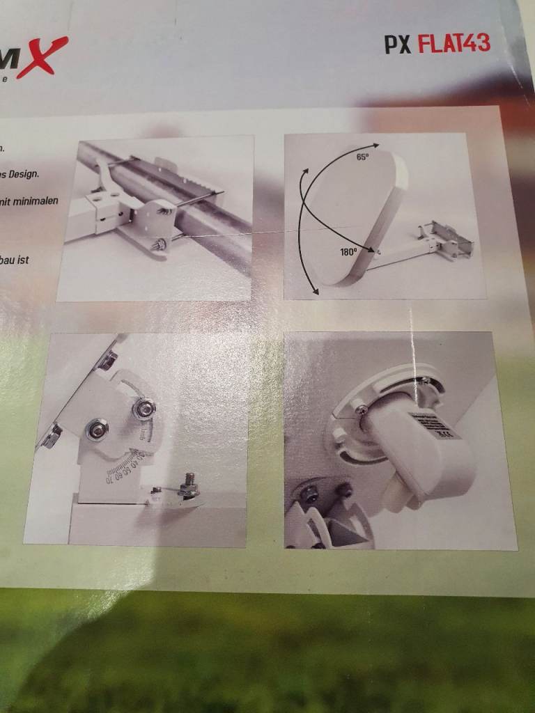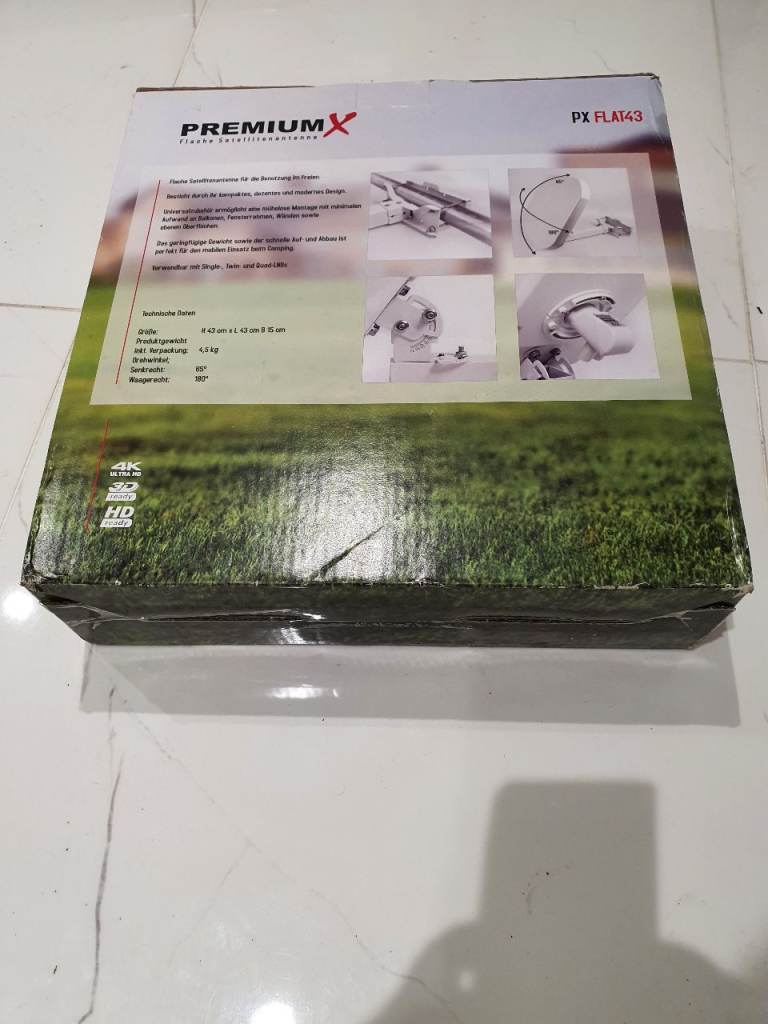 New 43cm flat satellite dish. Receive Astra/Hotbird or other satellites - simply mount and align on the mast, on the roof or balcony, on the wall, on the window, or on the stand.