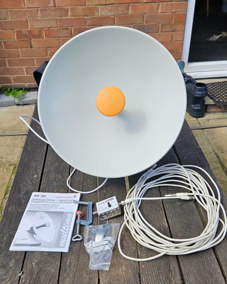 Included are all the original clamps and user manual as well as the satellite finder and cabling. The 40cm diameter of this design has a similar gain to a larger (standard) offset design.