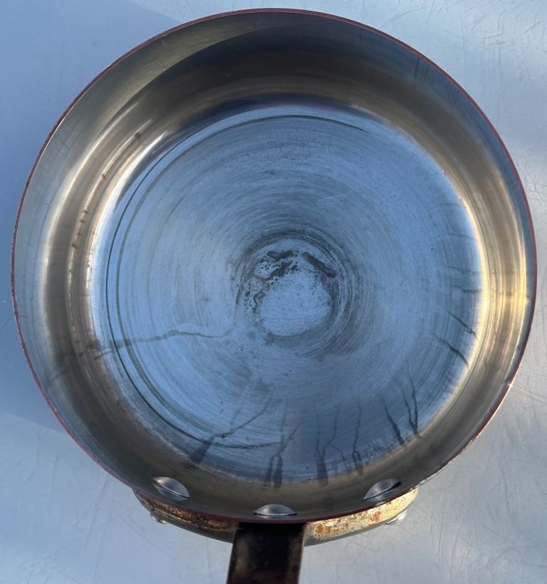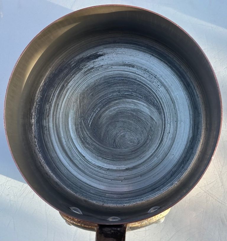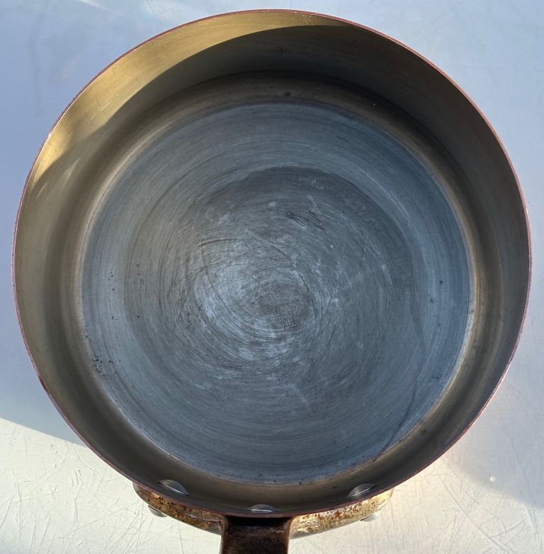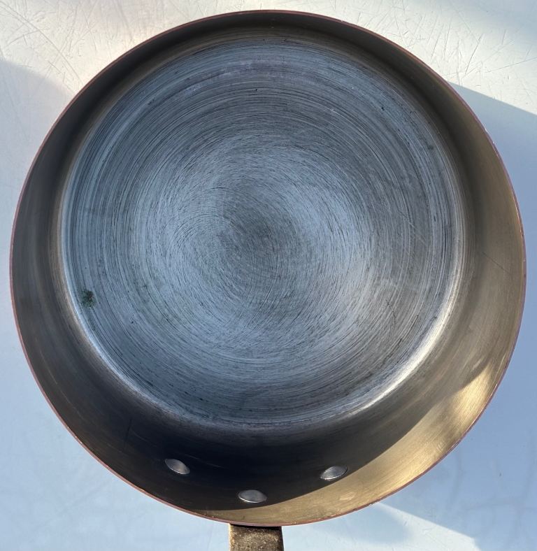 The smallest 12 cm pan has a very small area of wear/pitting down to bare copper - see photos.