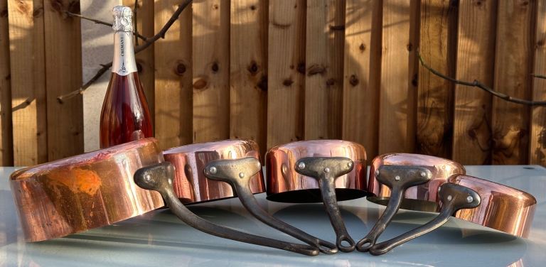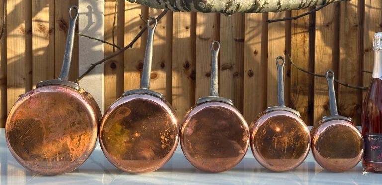 Part of our collection of French copper kitchenalia, we got these from a brocante at Reims in the Champagne region.