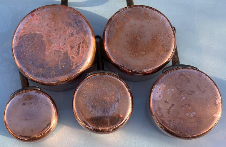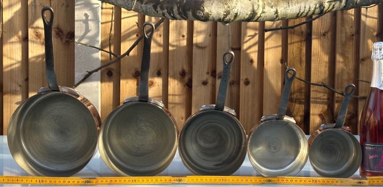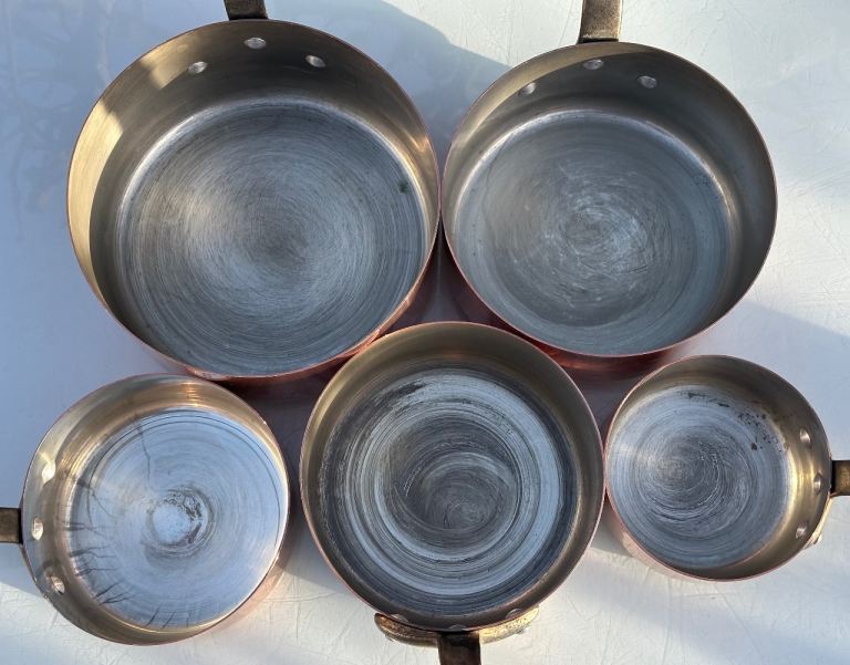Dating to around the 1970s, this is a set of five good quality graduated copper pans with riveted iron handles and what I think is a traditional tin lining which is worn but sound.