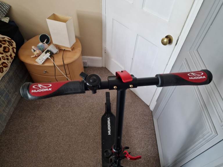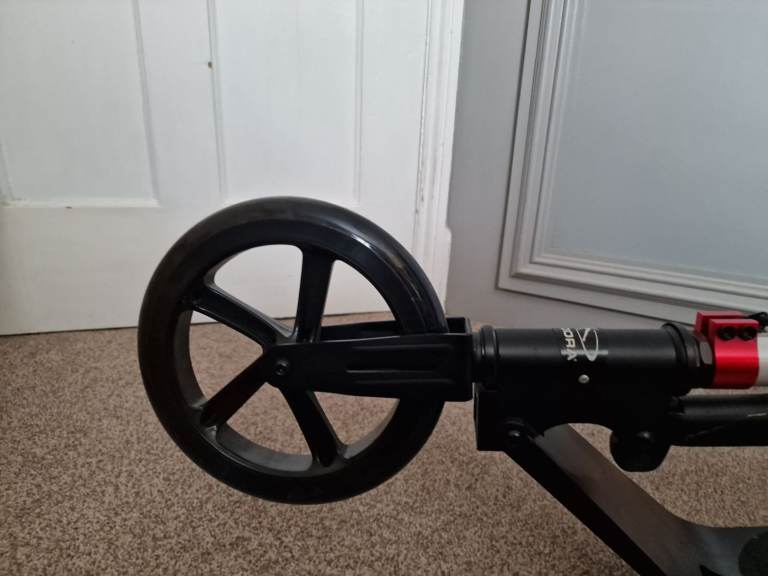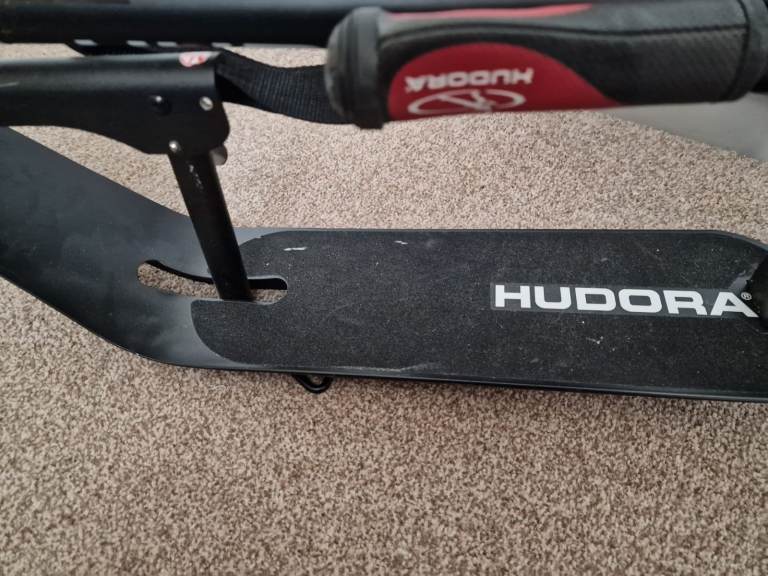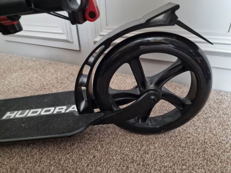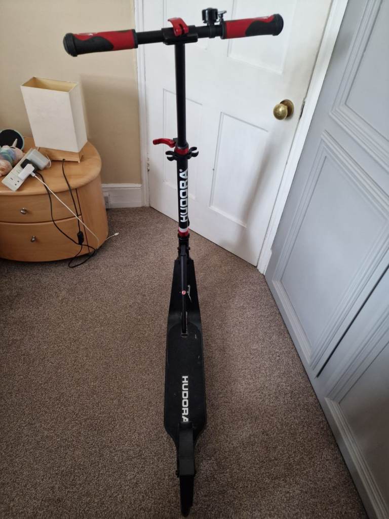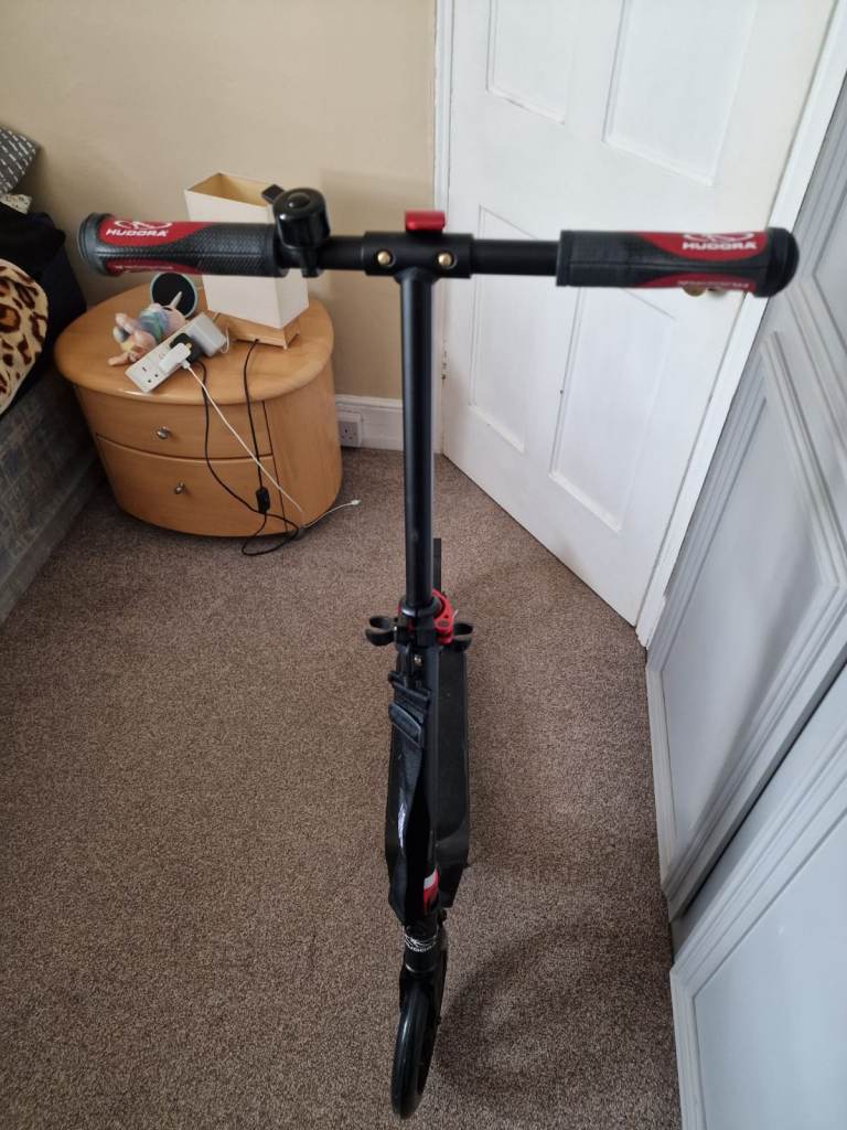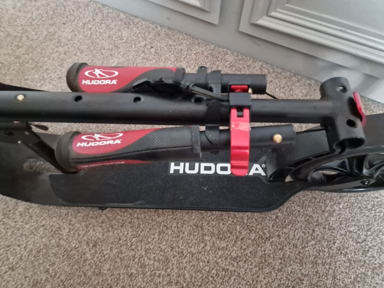 Hudora adult push scooter in sleek and red. Never used. Large wheels and large footplatform. Rear wheel brake. Comfortable handle bars with padding and a bell. Scooter stand. All collapsible and has strap to help carry. About a year old. Pick up only open to offers