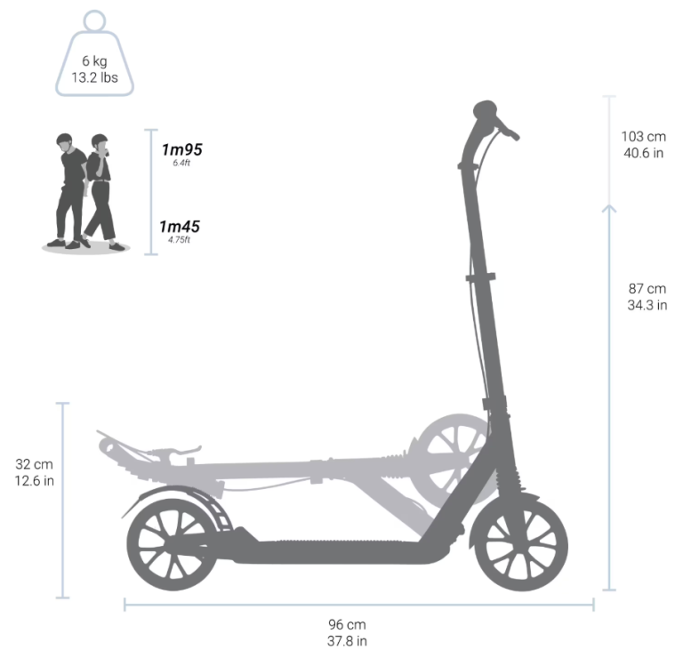 - The scooter can be adjusted to heights between 87cm to 103cm, which is suitable for users between 1.45m to 1.95m tall.