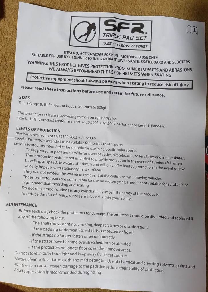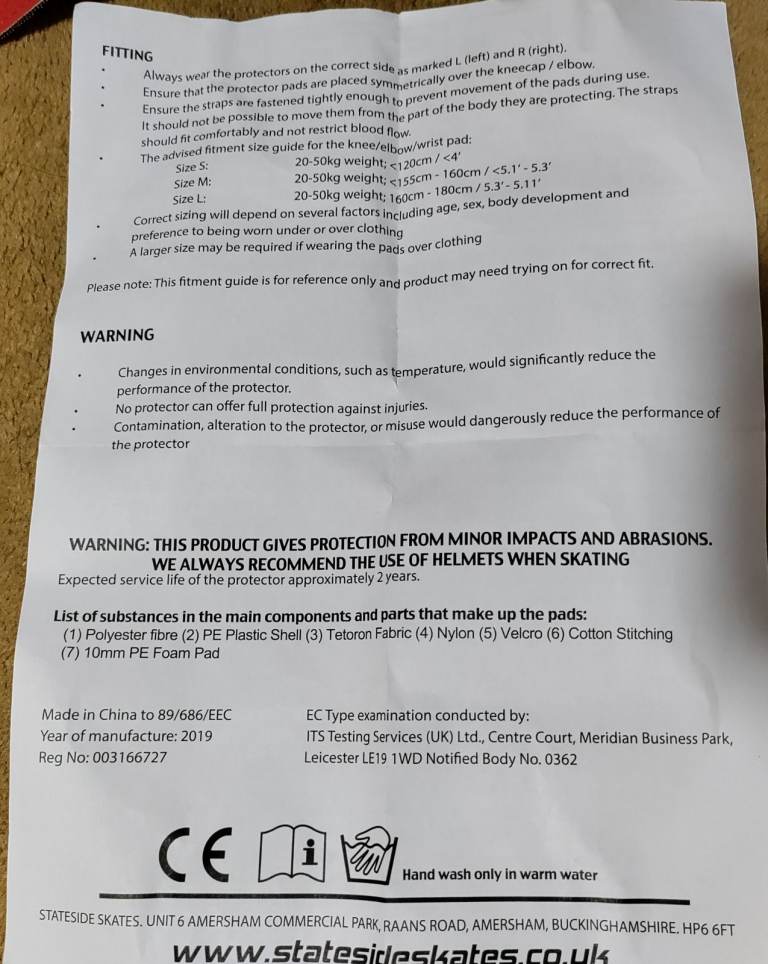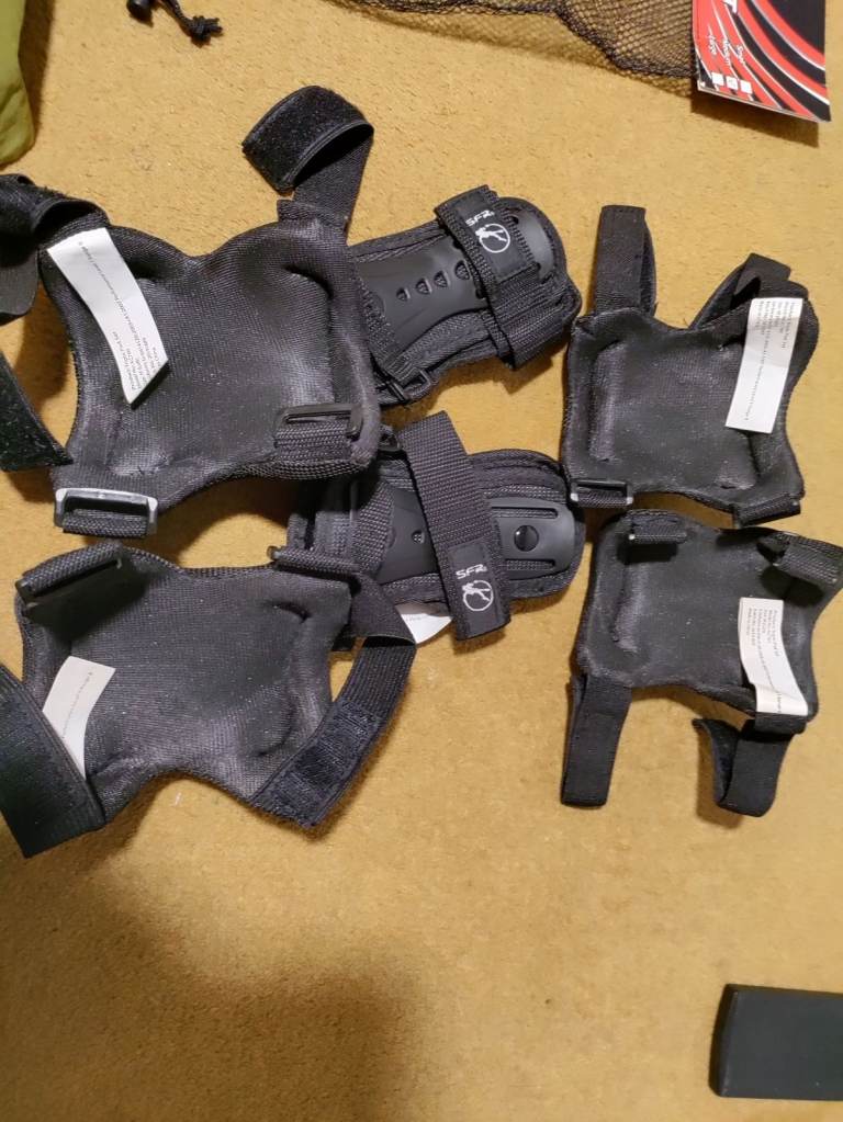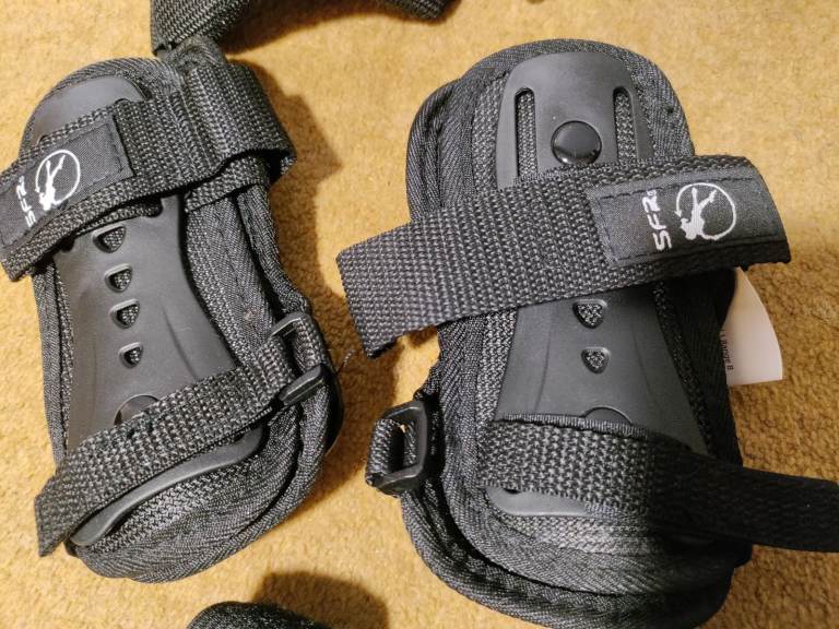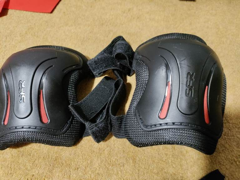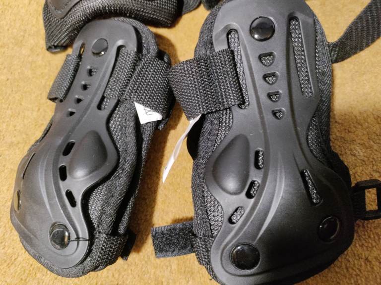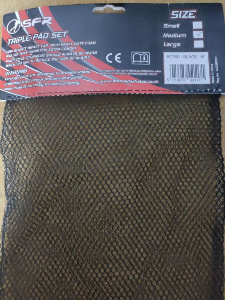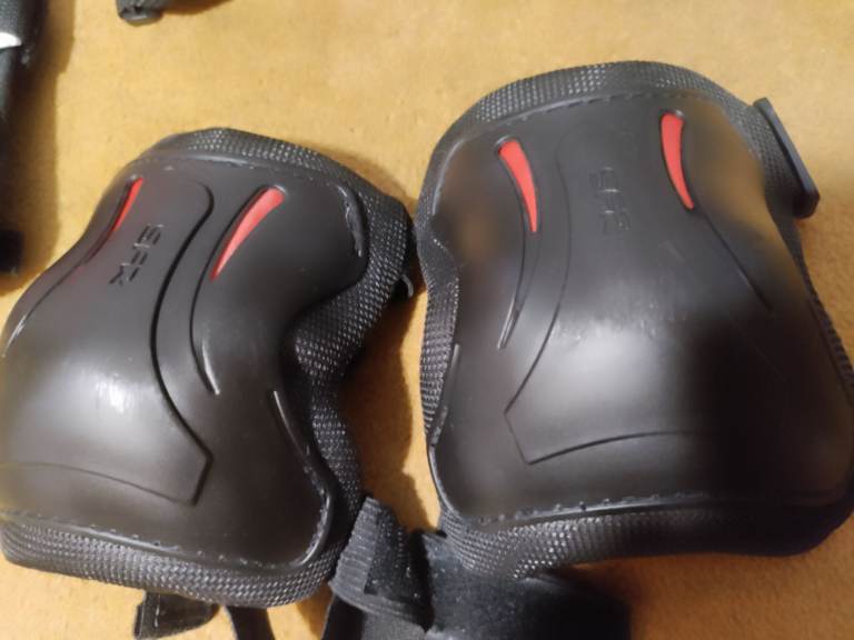 Medium sized knee, elbow, wrist pad set with light scuffs on the knee. Very comfortable, strong but lightweight.
