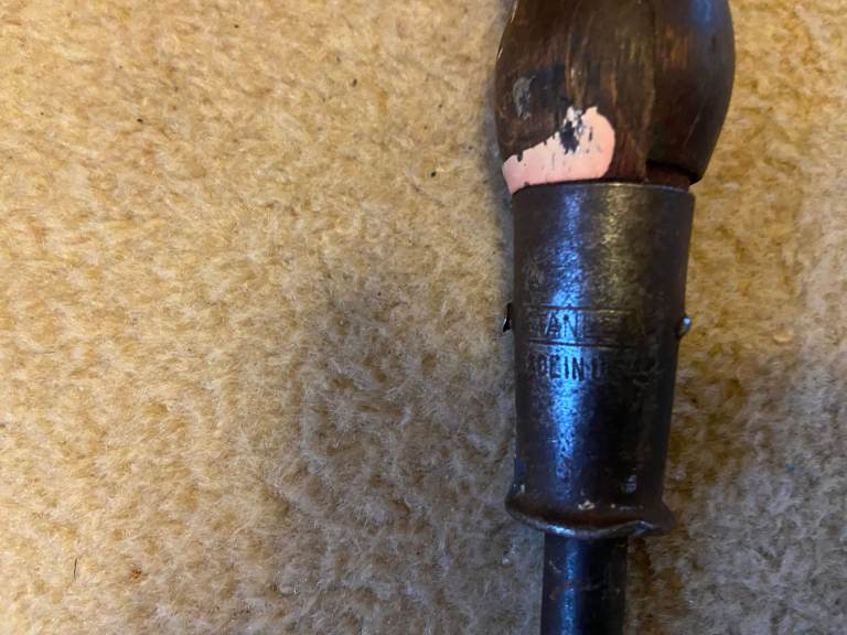 A vintage screwdriver with a damaged wooden handlemade by Stanley USA-almost 14 ins long