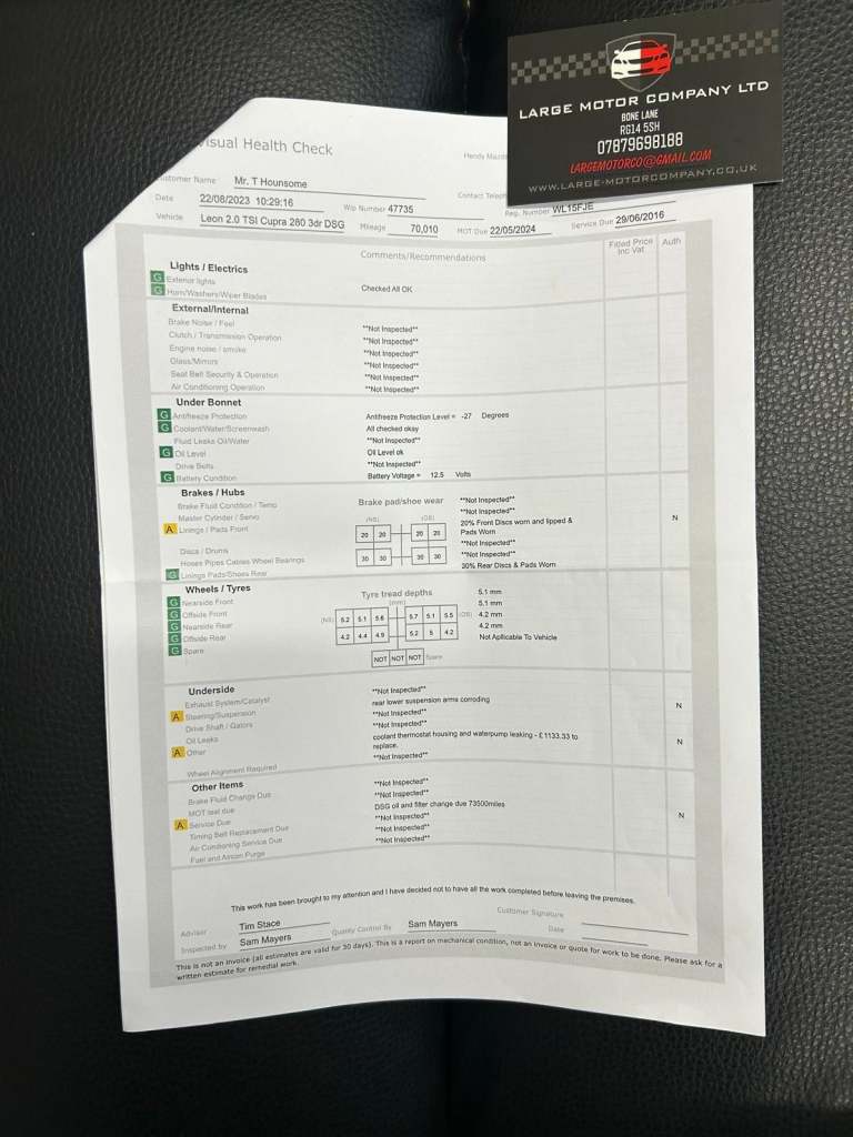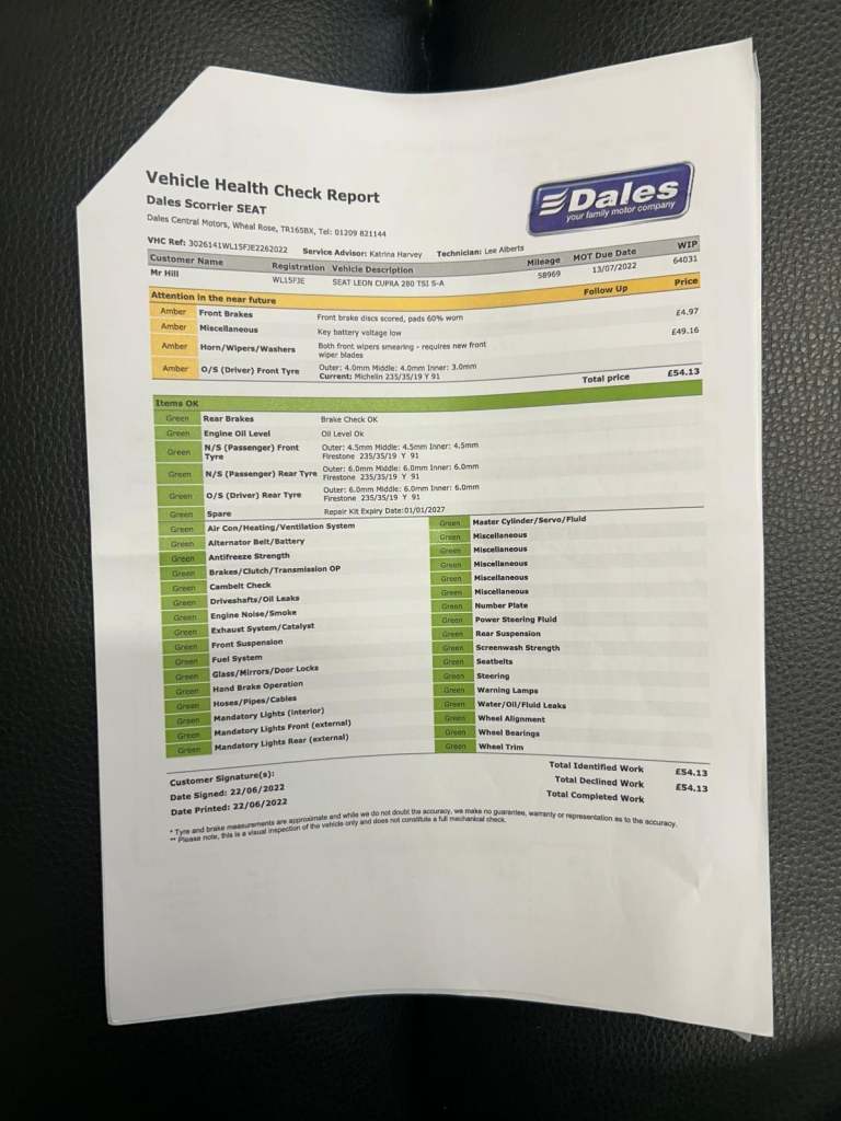 This 2015 SEAT Leon TSI Cupra 280 boasts a full service history, with its last service completed at 96,754 miles, offering you peace of mind. This Euro 6 compliant 2.0 litre petrol model comes with a 3 month warranty and a 12 month MOT provided on purchase. It features the desirable CUPRA Black Line Pack and CUPRA Orange Line Pack, alongside the CUPRA Sub8 Performance Pack. Inside, you'll find a Navigation System High and the SEAT Sound System for an enhanced driving experience.Experience exhilarating performance with this SEAT Leon, capable of accelerating from 0 to 62mph in just 5.7 seconds, a testament to its sporty nature. The large boot space ensures practicality for everyday use and longer journeys. These features, combined with its comprehensive service history and included warranty, demonstrate the exceptional value and quality of this particular Cupra 280 model.