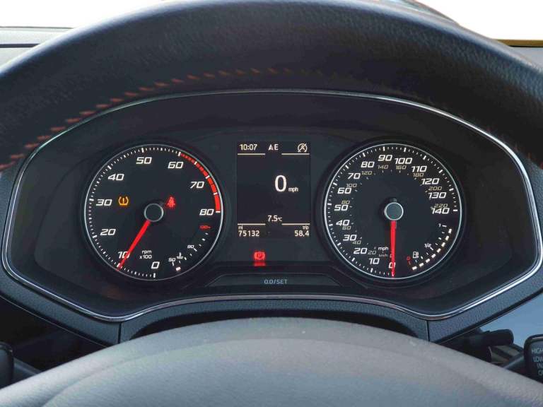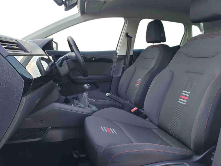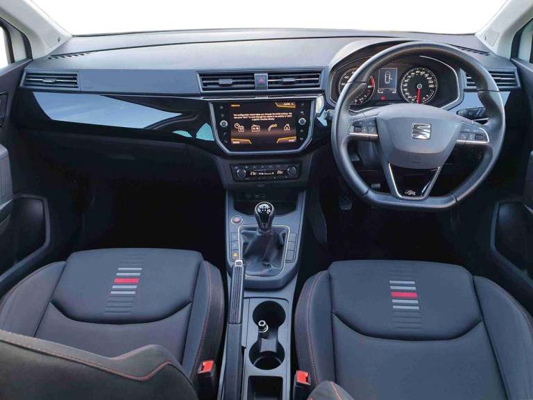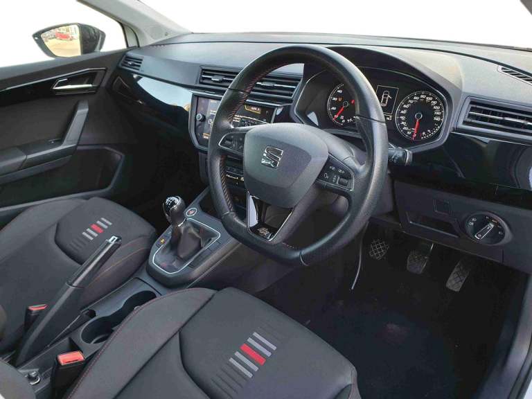 ..'Lights On' Reminder warning buzzer, Bluetooth Handsfree Phone Connection, Digital clock, Low fuel warning light, Outside temperature gauge, Satellite navigation system with 3D mapping, SEAT Drive profile, SEAT logo boot release, Speed sensitive power steering, Trip computer, Sports suspension, Auxiliary input socket, Digital Audio Broadcast (DAB) Tuner, Radio/MP3 player, SD card slot, Steering wheel mounted controls, USB port, Auto dimming rear view mirror, Automatic headlights, Automatic rain sensing wipers, Body colour bumpers, Body colour door handles, Brilliant black door mirrors, Chrome grille, Coming home headlight function, Cornering front fog lights, Dark tinted rear windows, Electric folding door mirrors, Electric front windows + one touch + anti-pinch, Electric headlight adjustment, Electrically adjustable and heated door mirrors, Exclusive FR front and rear bumpers, LED daytime running lights, LED tail lights, Twin exhaust pipes, 3 rear headrests, 60/40 split folding rear seat, Driver's sunvisor with ticket holder/vanity mirror, Dust/pollen filter, Flat bottom sports leather steering wheel, Front courtesy lights, Front cupholders x 2, Front reading lights, Glovebox, Height adjustable driver's seat, Height adjustable front/rear head restraints, Height adjustable passenger seat, Height/reach adjust steering wheel, Illuminated boot, Instrument lighting with brightness control, Leather handbrake, Leather steering wheel and gear knob, Rear top tether child seat ISOFIX attachment, Sports seats, Full link media system pack with apple Carplay - Ibiza, Media system plus pack with 8.0'' colour touchscreen - Ibiza, 3 point seatbelts on all 3 rear seats, ABS, Active front headrests, Child locks on rear doors, Curtain airbags, Driver/Front Passenger airbags, ESP+EBA, Front passenger airbag deactivation, Front side airbags, Hill hold control, Multi-Collision braking, Seatbelt warning, Tiredness recognition system, Tyre pressure monitoring system, 2 folding remote keys with window open/close function, Electronic engine immobiliser, Locking wheel bolts, Remote central locking + deadlocks, Volumetric alarm with back up horn