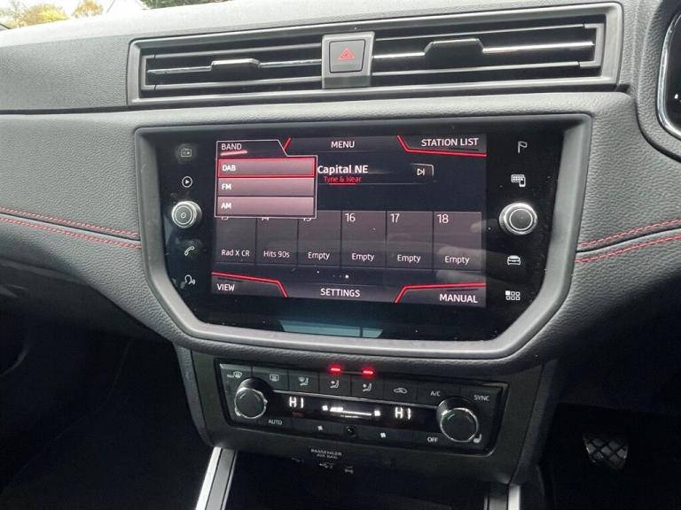 This 2019 SEAT Arona TSI FR Sport boasts an exceptionally low mileage for its age, having covered just 42,235 miles. This particular example comes with Great service history, a clear vehicle history check, and will be supplied with a 12 month MOT and Next Scheduled Service for your peace of mind. The 1.0 litre petrol engine is Euro 6 compliant, and the vehicle is offered with a 3 month warranty. The FR Sport trim level enhances the driving experience with features such as full LED headlights and auto headlights, ensuring excellent visibility. For convenience, it includes rear parking sensors and a Bluetooth system for handsfree calls and audio streaming. You can also enjoy the comfort of dual zone climate control. With an impressive fuel economy of 48 mpg and low CO2 emissions, this Arona offers a more economical and environmentally conscious choice compared to many other vehicles in its class. For a full walk round Video sent Via WhatsApp please call [Phone number removed] *** VIEWING IS BY APPOINTMENT ONLY *** 3 Months warranty, extended warranties available please ask for details, 12 Months AA Cover ( Terms and Conditions Apply ), Part exchange welcome , Low Rate Finance with Rates From 10.9 % APR Available (subject to status ,terms and conditions apply please ask for details ) Existing finance cleared, Read our 5 Star Reviews, Please call 01642 996361 or email [Email address removed. Click Email button to contact us.] to book your appointment, To View all our cars visit [Website URL removed]. 18in Alloy Wheels - Performance,Active Front Head Restraints,Alarm with Back-Up Horn,Anti-Lock Braking System - ABS,Anti-Theft Roof Antenna,Auto Dimming Rear View Mirror,Auto-Headlights,Automatic Warning Lights,Bi-Colour Roof,Bluetooth Audio Streaming with Handsfree System,Body-Coloured Door Handles,Child Locks on Rear Doors,Chrome Window Trim,Coming Home - Leaving Home Headlight Function,Connectivity Pack Plus,Cruise Control,DAB - Digital Radio,Dark Tinted Rear Windows,Digital Clock,Digital Cockpit,Double Boot Floor,Driver Sunvisor with Mirror and Card Holder,Driver and Front Passenger Airbags,Dual Zone Climate Control,Dust and Pollen Filter,ESC - Electronic Stability Control with EBA - Emergency Brake Assist,Electric Windows - Front and Rear with One-Touch and Anti-Squeeze,Electrically Adjustable Folding and Heated Door Mirrors,Electro-Mechanical Power Steering - Speed-Sensitive,Electronic Engine Immobiliser,Emergency Tyre Repair Kit,Exclusive Flat-Bottomed FR Steering Wheel and Interior Details,Exhaust Pipe - Twin,FM-AM Radio,Front Assist,Front Courtesy Light with Front and Rear Reading Lights,Front Fog Lights,Front Grille Frame in Chrome,Front Passenger Airbag De-Activation,Front Side and Curtain Airbags,Front and Rear Seatbelt Reminder,Full LED Headlights,Gearshift Indicator,Height Adjustable Drivers Seat,Height Adjustable Front Passenger Seat,Height and Reach Adjustable Steering Wheel,Hill Hold Control,ISOFIX Points in Outer Rear Seats with Top Tether Anchorage Points,Illuminated Boot,Instrument Lighting with Brightness Control,Interior Ambient Light,Interior Chrome Pack,Interior Footwell Light,LED Daytime Running Lights,LED Licence Plate Lighting,LED Taillights,Leather Handbrake,Leather Steering Wheel and Gear Knob,Lights Left On Warning Buzzer,Locking Wheel Bolts,Low Fuel Warning Light,Multi-Collision Braking System,Multicoloured Ambient Lighting,Outside Temperature Gauge,Passenger Sunvisor with Mirror and Card Holder,RPM Counter,Rain Sensing Wipers,Rear Fog Light,Rear Parking Sensors,Rear Window Wiper with Washer,Remote Central Locking with Deadlocks,Roof Coloured Door Mirrors,Roof Rails - Chrome,SEAT Drive Profile,Seats - Sports FR,Six Speakers,Split Folding Rear Seats - 60-40,Sports Suspension,Three-Point Seatbelts on All Rear Seats,Tiredness Recognition System,Trip Computer,Two Cup Holders in Cabin,Two Folding Remote Keys with Remote Window Opening-Closing Function,Two Front and Three Rear Height-Adjustable Headrests,Tyre Pressure Monitoring System,USB Media Cable,Visible VIN in Windscreen,Windshield Wiper with Intermittent Control and Potentiometer - Four Speeds,Microsuede - Black with Red Stitching