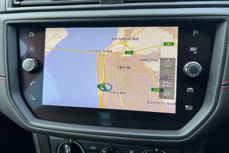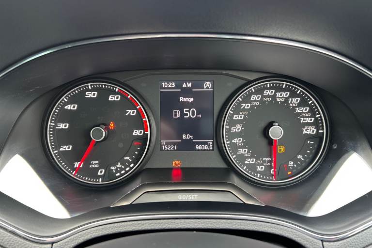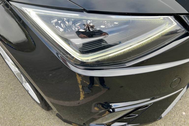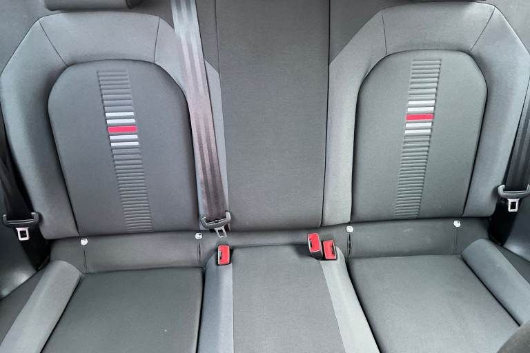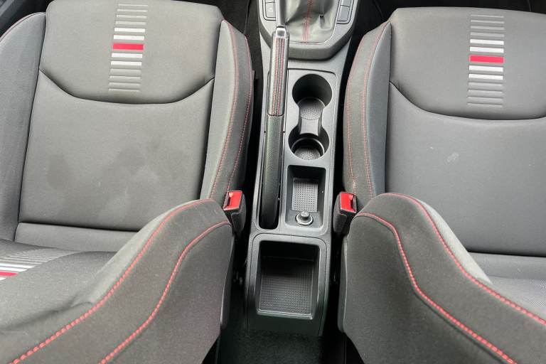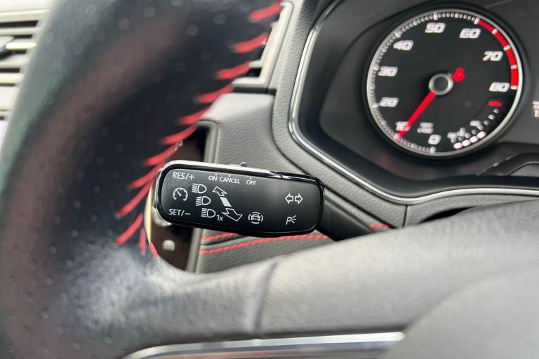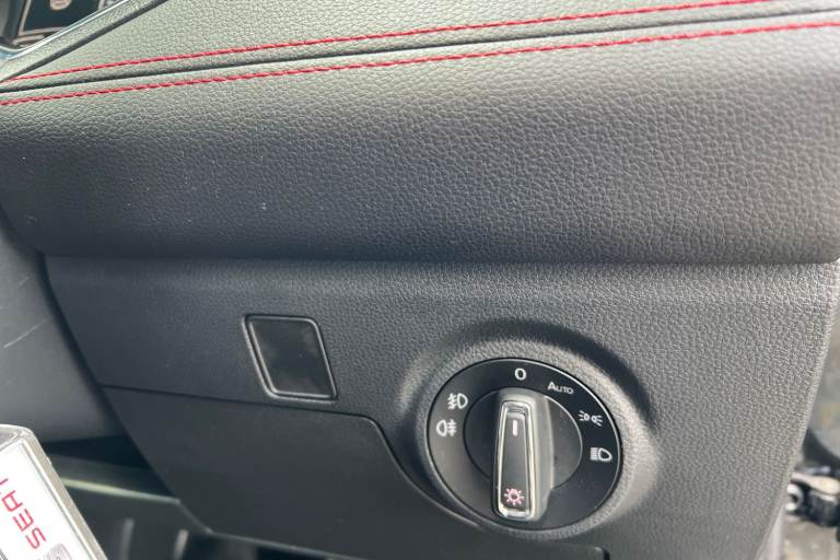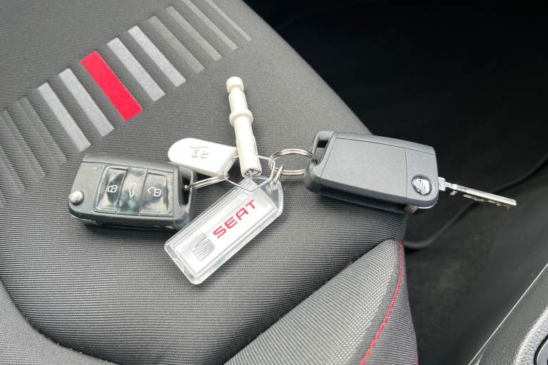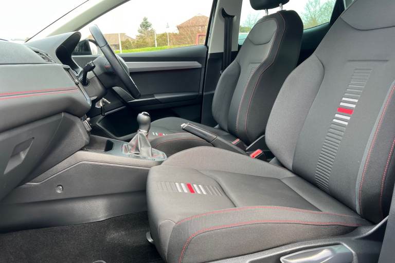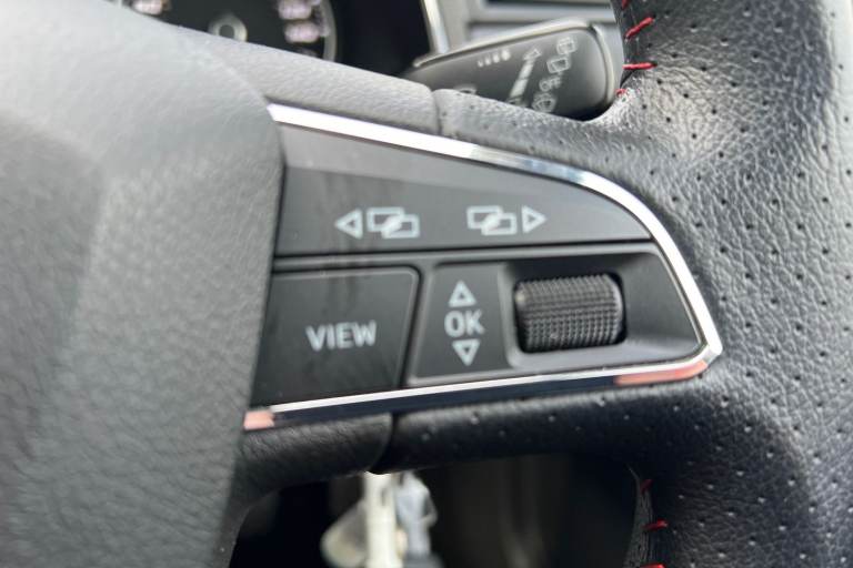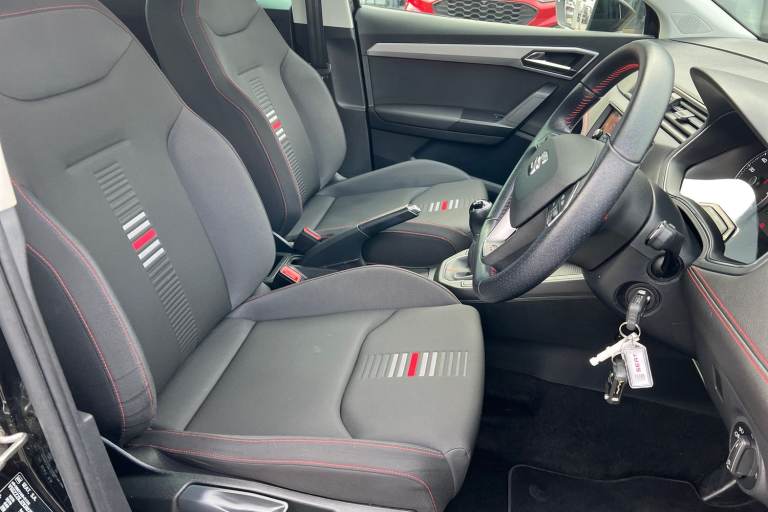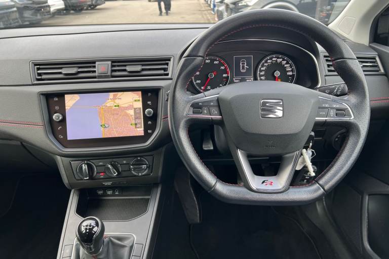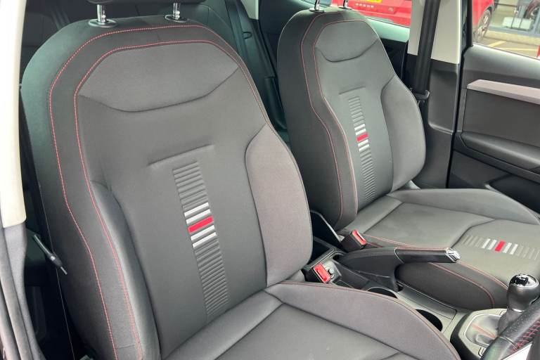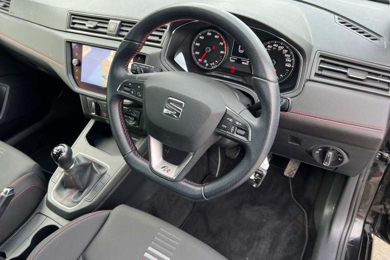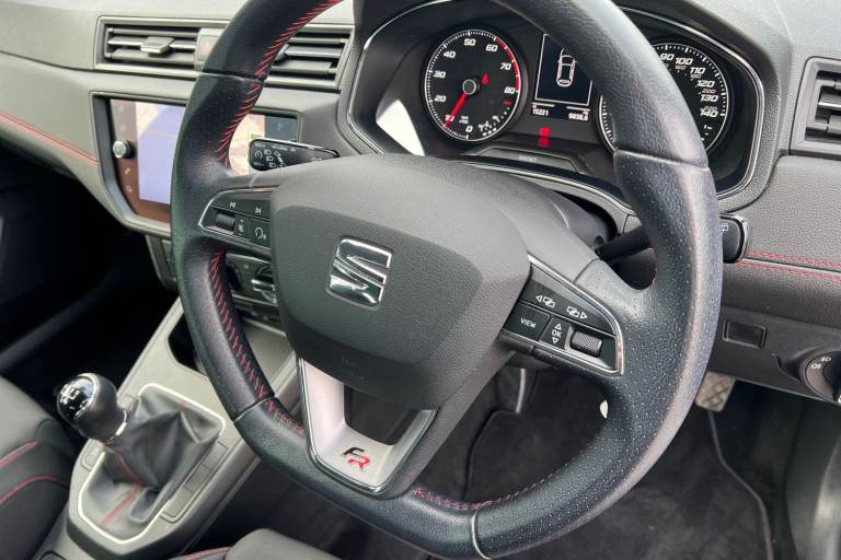 ..FR Cloth - Nora Black, Space-Saving Spare Wheel, Seat Approved Sale, No Administration Fees Applicable, 12 Months Seat Approved Warranty, 145 Point Seat Approved Mechanical/Safety Check, 12 Months Roadside Assist, Metallic paint, Metallic - Midnight black, Cloth - Nora Black, Automatic rain sensing wipers, Dark tinted rear windows, Electric front windows, Sports suspension, Anti theft roof antenna, Body colour bumpers, Body colour door handles, Chrome front grille frame, Chrome grille, Exclusive FR rear bumper, Twin exhaust pipes, Automatic headlights, Coming/leaving home lighting function, Cornering front fog lights, Electric headlight adjustment, Full LED headlights, LED daytime running lights, LED tail lights, Rear fog lights, ABS, ESP+EBA, Front assist (AEB), Hill hold control, Multi-Collision braking, Cruise control, SEAT Drive profile, Speed sensitive power steering, Auto dimming rear view mirror, Brilliant black door mirrors, Electric folding door mirrors, Electrically adjustable and heated door mirrors, 3 point seatbelts on all 3 rear seats, Active front headrests, Child locks on rear doors, Curtain airbags, Driver/Front Passenger airbags, Front passenger airbag deactivation, Front side airbags, Seatbelt warning, Tiredness recognition system, Tyre pressure monitoring system, Bluetooth Handsfree Phone Connection, 6 speakers, Auxiliary input socket, CD player, Digital Audio Broadcast (DAB) Tuner, Radio/MP3 player, SD card slot, SEAT USB media cable, Steering wheel mounted controls, USB port, SEAT logo boot release, 'Lights On' Reminder warning buzzer, Digital clock, Full Link Smartphone Integration with Mirror Link, Apple Car Play, Google Android Auto, Low fuel warning light, Outside temperature gauge, Satellite navigation system with 3D mapping, 8'' touch screen, voice control and additional USB port, Trip computer, Black dash trim, Leather dashboard, 3 rear headrests, 60/40 split folding rear seat, Height adjustable driver's seat, Height adjustable front/rear head restraints, Height adjustable passenger seat, Rear top tether child seat ISOFIX attachment, Sports seats, Air conditioning, Dust/pollen filter, Door and steering wheel ice metal decorative inserts, Flat bottomed perforated leather steering wheel with red stitching and FR logo, Front cupholders x 2, Gear shift indicator, Glovebox, Height/reach adjust steering wheel, Leather handbrake, Leather steering wheel and gear knob, Nora cloth upholstery, Passenger sunvisor, Front courtesy lights,