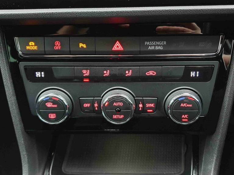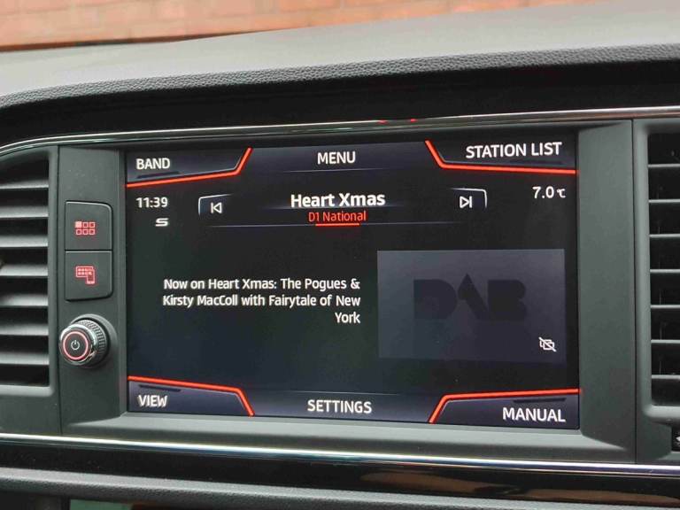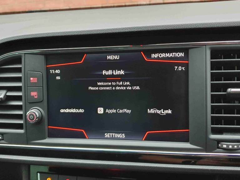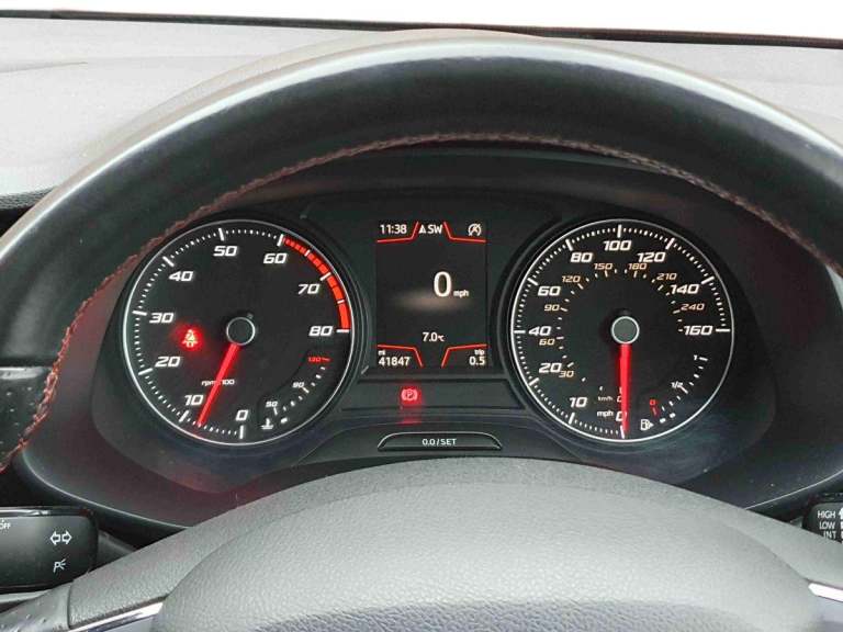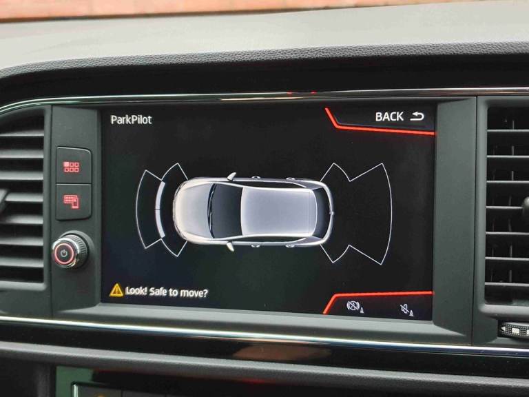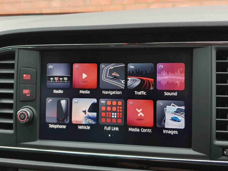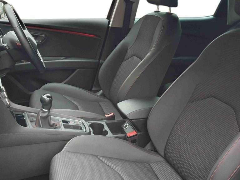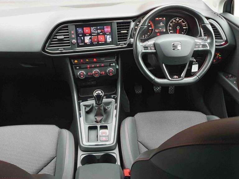 ..'Lights On' Reminder warning buzzer, 3D map display, 8'' touch screen, Bluetooth Handsfree Phone Connection, Electro-mechanical power steering, Front and rear parking sensors, Front assist with pedestrian protection, Full Link Smartphone Integration with Mirror Link, Apple Car Play, Google Android Auto, Low fuel warning light, Navigation system (incl. media system plus), Outside temperature gauge, RPM counter, SEAT Drive profile, SEAT logo boot release, Service interval indicator, Trip computer, Voice recognition, Lowered sports suspension, XDS electronic differential lock, 2x SD card slot, 4 USB, 8 Speakers, Auxiliary input socket, Bluetooth audio streaming, CD player, DAB Digital radio, High resolution colour driver display, Media system plus (incl. media system colour), SEAT USB media cable, Steering wheel mounted audio/phone controls, Black radiator grille, Body colour door handles, Body coloured bumpers, Body coloured exterior mirrors with integrated LED indicators, Chrome-plated radiator grille surround, Dark tinted rear windows, Electric front/rear windows, Electrically adjustable door mirrors, Electrically foldable exterior mirrors with parking position and passenger-side mirror with lowering function, Exclusive FR front and rear bumpers, Heated door mirrors, High gloss black finish B and C pillars, Illuminated aluminium front door sill with FR logo, LED front fog lights, LED headlights with LED day time running lights + LED rear lights + LED number plate lights, Rear wash/wipe, Visible twin exhaust tailpipes, 12v power point in centre console, 60/40 split folding rear seat with armrest, Active front headrests and 3 rear headrests, Additional heating and ventilation outlet in rear of centre console, Boot storage net, Cargo rings in boot, Driver and passenger seat height adjust, Driver seat lumbar adjustment, Dual zone climate control, Dust/pollen filter, Flat bottomed perforated leather steering wheel with red stitching and FR logo, Front adjustable head restraints, Front armrest with storage box, Front cupholders x 2, Front seatback storage pockets, Front sport seats in Techny cloth, Front/rear floor mats, Gear shift indicator, Height/reach adjust steering wheel, High centre console with integrated box & cup holder, rear air outlet, with armrest in front seats, Illuminated door sills, Instrument lighting with brightness control, Luggage tie-down hooks, Multi-colour ambient interior lighting, Passenger seat lumbar adjust, Rear top tether child