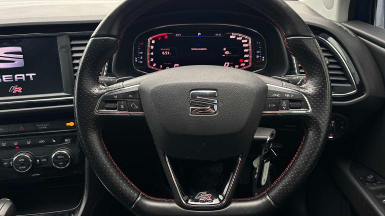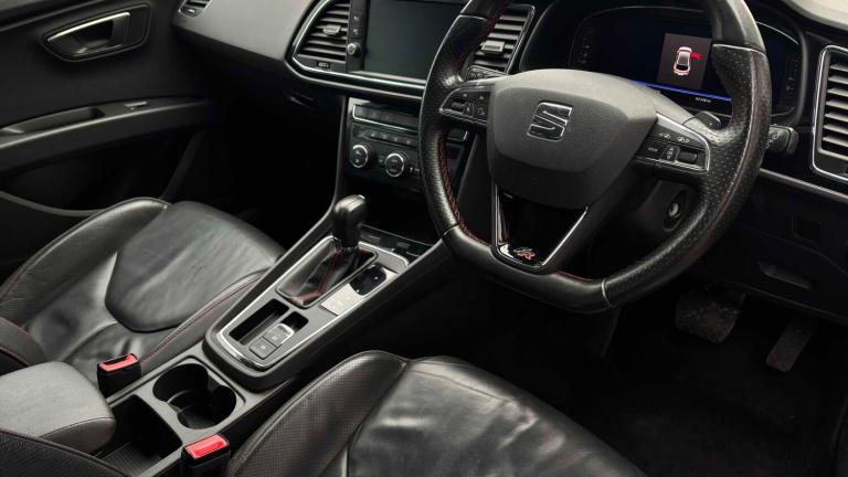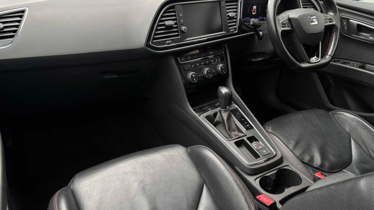 12V Power Supply in Centre Console, Cruise Control, Digital Clock, Dynamic Chassis Control and Progressive Direction, Electro-Mechanical Power Steering, Electronic Differential Lock System - XDS, Front and Rear Parking Sensors, Full LED Headlights, Gearshift Indicator, Lights Left On Warning Buzzer, Low Fuel Warning Light, Lower Suspension - 15mm, Navigation System, Outside Temperature Gauge, RPM Counter, SEAT Drive Profile, SEAT Full Link Smartphone Integration - Mirror Link - Apple CarPlay - Google Android Auto, Sports Suspension, Trip Computer, USB Cable for Apple and Android Compatibility, 18in Alloy Wheels - Performance 30-1, Body-Coloured Door Handles, Body-Coloured Door Mirrors with Integrated LED Indicators, Bumpers - Exclusive FR Front and Rear, Dark Tinted Rear Windows, Electrically Adjustable and Heated Door Mirrors, Electrically Foldable Exterior Mirrors with Parking Position and Passenger-Side Mirror with Lowering, Emergency Tyre Repair Kit, Front and Rear Electric Windows, High Gloss Black B and C Pillars, Radiator Grille Frame in Chrome, Radiator Grille in Black, Visual Twin Exhaust Pipes, 7 Airbags, ABS and Traction Control System - TCS - Electronic Stability Control - ESC - and Electronic Differential Lock System - XDS, Alarm - Volumetric, ESC - Electronic Stability Control and Tyre Pressure Warning Light Indicator, Electric Parking Brake Including Autohold Function, Front Assist with Pedestrian Protection, Hill Hold Control, ISOFIX Points in Outer Rear Seats with Top Tether Anchorage Points, Multi-Collision Braking System, Remote Central Locking with Deadlocks, Seatbelt Reminder - Front, Two Folding Keys with Window Open-Close - Door and Boot Opening Functionality, Two Remote Keys with Window Open-Close - Door Mirror Folding and Boot Opening Functionality, Boot Storage Net, Cargo Rings in the Boot, Convenience Pack Plus, Digital Cockpit, Driver and Passenger Seat Height Adjustment, Driver and Passenger Sunvisor with Covered and Illuminated Mirrors, Drivers Seat Lumbar Adjustment, Dual Zone Climate Control, Front Seat Back Storage Pockets, Front Sports Seats, High Centre Console, Illuminated Aluminium Front Door Sill Trims with FR Logo, Instrument Lighting with Brightness Control, Interior Chrome Detailing, Interior FR Black - Black Glossy, LED Interior Illumination Pack, Multi Coloured Ambient Lighting, Seats - Passenger Lumbar Adjustment, Split Folding Rear Seats - 60-40, Steering Wheel - Flat-Bottomed Perforated Leather with Red