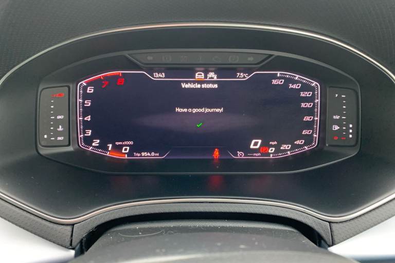 ..Digital cockpit, E-call, Electric speed sensitive power steering, Full Link Smartphone Integration with Mirror Link, Apple Car Play, Google Android Auto with USB Type C cable for Apple and Android compatibility, Lane keeping system, Rear parking sensor, Seat connect with safety, service, remote and online, SEAT Drive profile - Four different models normal-sport-eco-individual, steering response, throttle response, Bluetooth interface for hands free and audio streaming, DAB digital radio and AM/FM radio, Steering wheel mounted audio controls, Anti theft roof antenna, Auto dimming interior rear view mirror, Automatic activation of hazard warning lights, Body coloured bumpers, Body coloured door handle inserts, Chrome roof rails and window surrounds, Chrome window trim, Dark tinted rear windows, Electric front/rear windows, Electrically adjustable, heated and folding door mirrors, FULL LED automatic headlights with dynamic headlight range control, coming and leaving home, LED daytime running lights, LED rear tail lights and licence plate lights, Protective side mouldings, Rain sensing wipers, Rear side wing doors, Rear spoiler, Rear window wash/wipe, Roof colour door mirrors, Third brake light, Twin exhaust pipe styling hidden exhaust pipe, Visible VIN plate, Windshield wiper with intermittent control and potentiometer, 2 cupholders, 3 seat bench in 2nd row, 60/40 split folding rear seat, Aircare filter, Black interior roof, Daring red Illuminated coloured air vent, Double boot floor, Driver sunvisor with covered mirror + card holder, Dual zone climate control, Front courtesy light with 2x front and 2x rear reading lights, Front seat back storage pockets, Front sport seats, Heated front seats, Height adjustable front seats, Height/reach adjustable steering column, Illuminated boot, Interior ambient lighting, Interior light in footwell, central console and door panel, ISOFIX points in outer rear seats with top tether anchorage points, Microsuede cloth upholstery, Passenger sunvisor with vanity mirror, Perforated flat bottomed leather steering wheel/gear knob/handbrake with red stitching and FR logo, Single front passenger seat, Two front and three rear height adjustable headrests, Connectivity pack plus - Arona, Interior chrome pack - Arona, 3 point seatbelts on all rear seats, ABS, Active front headrests, Child locks on rear doors, Driver and front passenger airbags with front passenger airbag de activation, front side and curtain airbags, Electronic