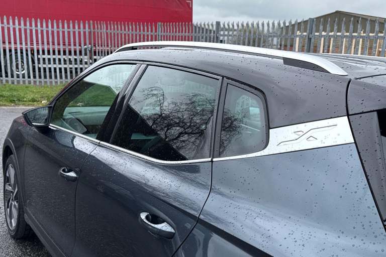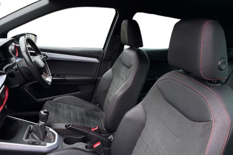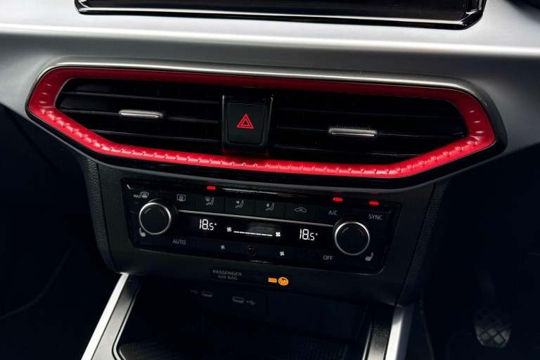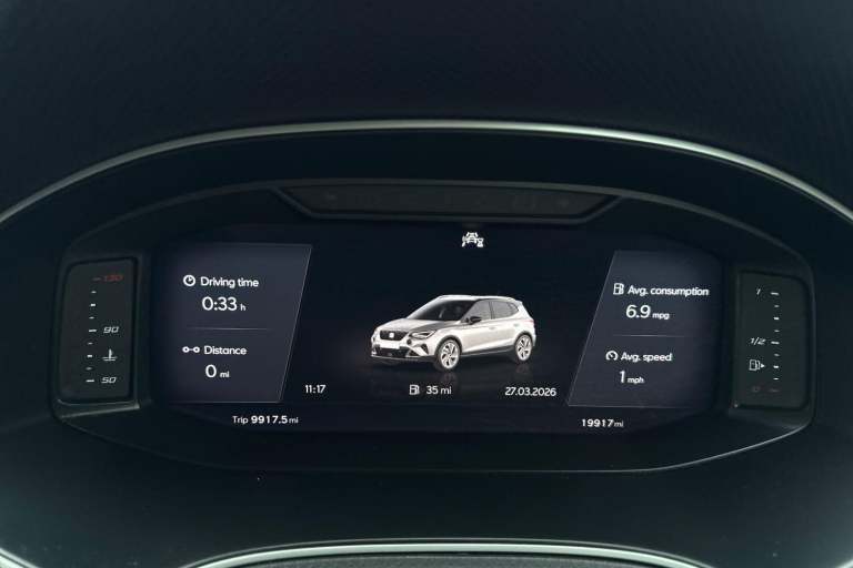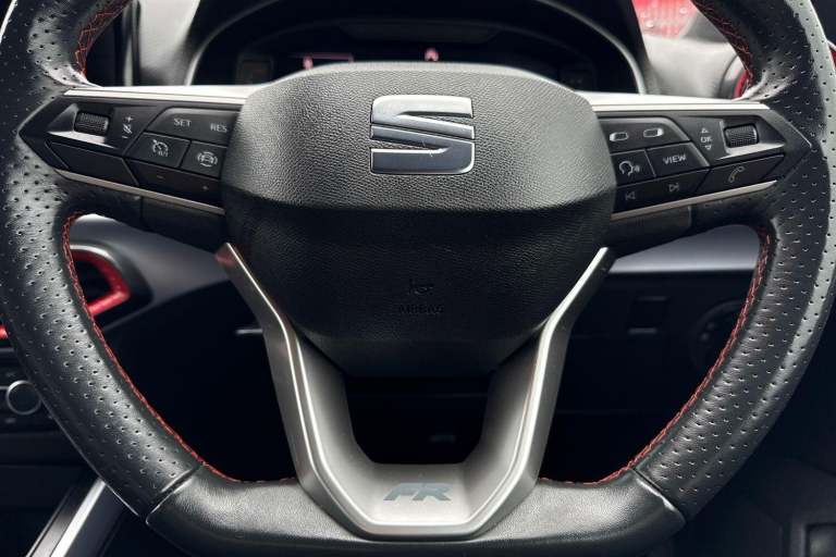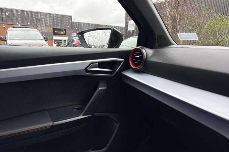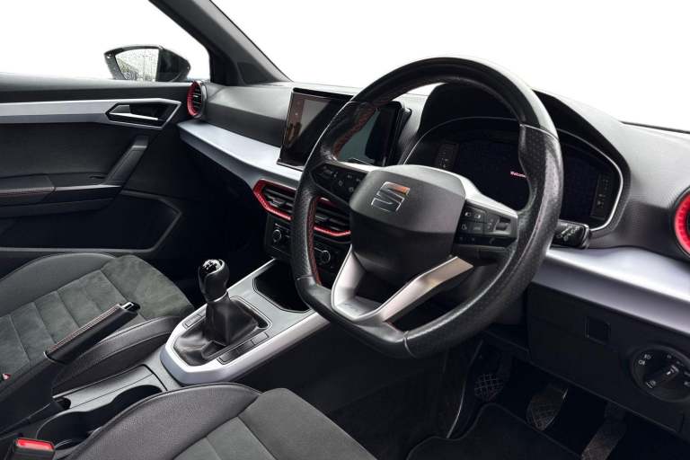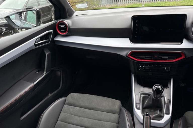 The SEAT Arona 1.0 TSI FR Sport Euro 6 (s/s) 5dr in Magnetic Tech Grey presents a confident and contemporary look, enhanced by its striking 18 inch Performance alloy wheels in Cosmo Grey Matt and subtle chrome detailing along the roof rails and window surrounds. Its sporty edge is further emphasised by a rear spoiler, dark tinted rear windows, and full LED lighting, including automatic headlights and distinctive daytime running lights, giving it a sharp presence on the road both day and night. Inside, the cabin combines practicality with refined styling, featuring a Titan Black dashboard, a black interior roof, and an interior chrome pack that adds a premium touch. The Digital Cockpit with its crisp 10 inch display works seamlessly with the intuitive 9.2 inch touchscreen infotainment system, offering easy access to navigation, media, and Full Link smartphone integration. Bluetooth audio streaming and a wireless phone charger ensure you stay connected without clutter, while ambient interior lighting enhances the overall driving atmosphere. Comfort is a clear priority, with front comfort seats that are also heated for colder days, dual zone climate control for personalised temperature settings, and thoughtful additions such as seatback storage pockets. The perforated leather flat-bottomed steering wheel with red stitching and FR branding, along with a leather gear knob and handbrake, adds a sporty, driver focused feel to the interior. On the road, the Arona delivers a smooth...