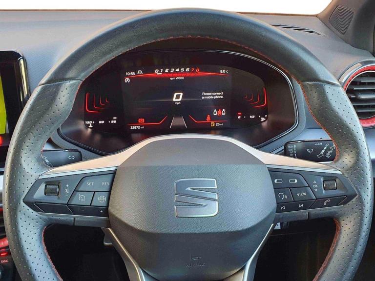 ..'Lights On' Reminder warning buzzer, 8'' Digital cockpit, 9.2'' touchscreen navigation system with type C USB socket, Voice control and DAB/AM/FM radio, Auto start and stop system, Bluetooth audio streaming with handsfree system, Digital clock, E-call, Full link smartphone integration with mirror link, wireless apple carplay, Google android auto + USB Type C cable for apple and android devices, Lane assist, Low fuel warning light, Outside temperature gauge, Power Steering, Seat connect with safety, service, remote and online, SEAT drive profiles and ECO function, SEAT logo boot release, Speed limiter, Trip computer, Sports suspension, Auxiliary input socket, Radio/MP3 player, SD card slot, Steering wheel mounted controls, Anti theft roof antenna, Auto dimming rear view mirror, Automatic rain sensing wipers, Black door mirrors, Body colour bumpers, Body colour door handles, Brilliant black window surrounds, Dark tinted rear windows, Electric adjustable/heated/folding door mirrors, Electric front windows, Electric headlight adjustment, Electric rear windows, Front/rear fog lights, FULL LED automatic headlights with dynamic headlight range control, coming and leaving home, LED daytime running lights, LED tail lights, Rear roof spoiler with FR twin exhausts, Rear side wing doors, Rear wiper, Third brake light, 3 seat bench in 2nd row, 60/40 split folding rear seat, Ambient interior lighting, Chrome detailing and black headlining, Cloth upholstery, Dual zone climate control with combination filter, Front courtesy lights, Front cupholders x 2, Front reading lights, Gear shift indicator, Glovebox, Height adjustable front and rear headrests (five), Height adjustable front seats, Height/reach adjust steering wheel, Illuminated air vent surrounds, Illuminated boot, Instrument lighting with brightness control, Isofix, Leather multifunction flat bottomed sports steering wheel, Passenger sunvisor, Single front passenger seat, Sports seats, Sunvisors with mirror and driver side card holder, 3 point seatbelts on all 3 rear seats, ABS, Active front headrests, Child locks on rear doors, Electronic stability control, Energy recovery system, Front assist forward collision warning and autonomous emergency braking, Front driver and passenger side airbags with curtain airbag and front passenger airbag deactivation, Hill hold control, Multi-Collision braking, Seat belt reminder for front and rear seats, Tiredness recognition system, Tyre pressure monitoring system, Electronic