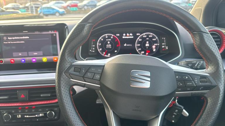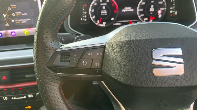 ..18in Alloy Wheels - Performance - Cosmo Grey Matt, Dark Tinted Rear Windows, Rear Parking Sensors, Heated Front Seats, Wireless Phone Charger, Cruise Control with Speed Limiter, Digital Cockpit - 10in, Front Comfort Seats, 9.2in Touchscreen Display, Contrast Roof, Aircare Filter, Alarm with Back-Up Horn, Anti-Lock Braking System - ABS, Auto Dimming Rear View Mirror, Black Interior Roof, Bluetooth Audio Streaming with Handsfree System, Chrome Roof Rails and Window Surround, Coloured Air Vent - Daring Red, Coming Home - Leaving Home Headlight Function, Double Boot Floor, Driver and Front Passenger Airbags, Dual Zone Climate Control, EBA - Emergency Brake Assist and Front Assist, Electrically Adjustable Folding and Heated Door Mirrors, Electronic Engine Immobiliser, Electronic Stability Control - ESC, Emergency Tyre Repair Kit, Front Courtesy Light with Front Reading Lights, Front Seats with Back Storage Pockets, Front and Rear Electric Windows, Front and Rear Fog Lights with Cornering Function at Front, Front and Rear Seatbelt Reminder, Full LED Automatic Headlight, Full Link Smartphone Integration, Height Adjustable Front Seats, Hill Hold Control, ISOFIX Points in Outer Rear Seats with Top Tether Anchorage Points, Illuminated Air Vent Surrounds, Interior Ambient Light, Interior Chrome Pack, Interior Light in Footwell - Centre Console and Door Panel, LED Daytime Running Lights, LED Rear Taillights, Lane Keeping System, Licence Plate Lights, Locking Wheel Bolts, Perforated Leather Flat-Bottomed Steering Wheel with Red Stitching and FR Logo with Leather Gear Knob and Handbrake, Power Assisted Steering, Protective Side Moulding, Rain Sensing Wipers, Rear Spoiler, Roof Coloured Door Mirrors, SEAT Connect - Safety - Service - Remote - Online, SEAT Drive Profile, Side Airbag in Front with Curtain Airbag, Six Speakers, Split Folding Rear Seats - 60-40, Sunvisors with Mirror and Cardholder - Driver Side, Three-Point Seatbelts on All Rear Seats, Tiredness Recognition System, Titan Black Dashboard, Twin Exhaust Pipes, Two Front and Three Rear Height-Adjustable Headrests, Tyre Pressure Monitoring System