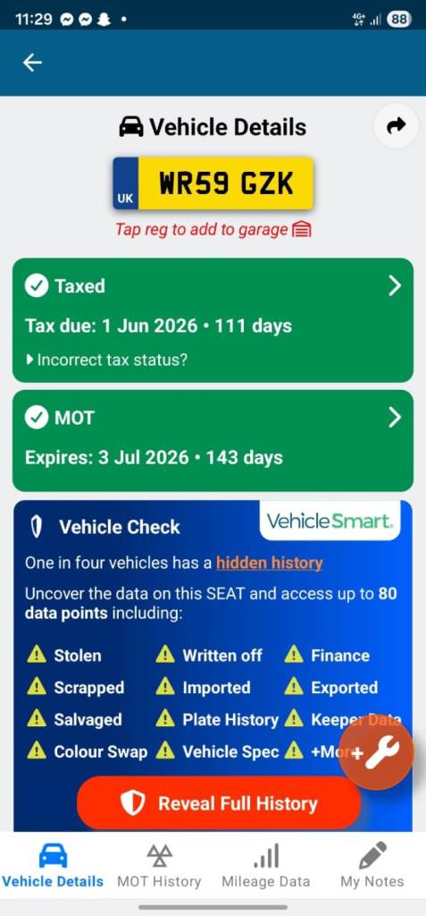 Buy the full report for guaranteed data accuracy, outstanding finance, valuation, milage check & VIN match for £9.99 (normally £19.99)