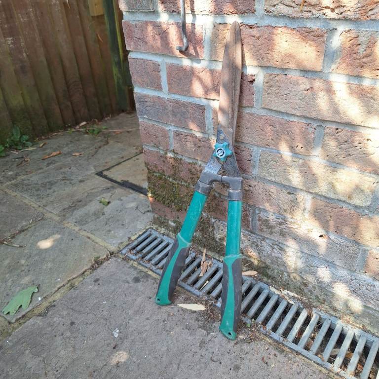 Green and black soft grip plastic handled garden shears with easy adjust tension screw. Recently sharpened and in good condition. Good tool, just not used.