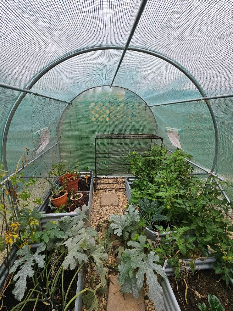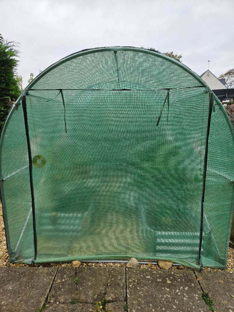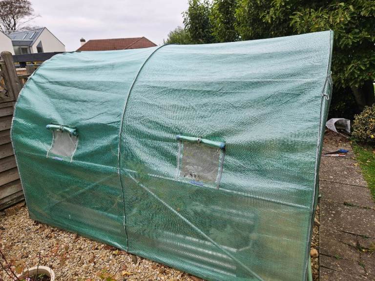 2m x 3m steel frame polytunnel. Approx 185cm high. Used from new for 2 seasons with great results. Some tears in mesh of window vents. Standard size for replacement covering in future.