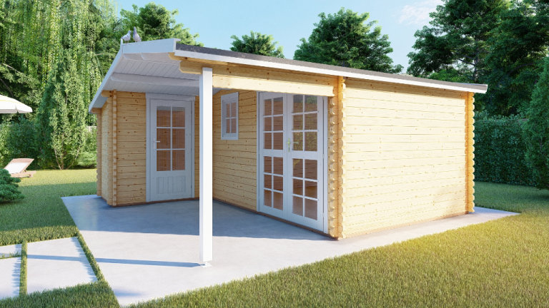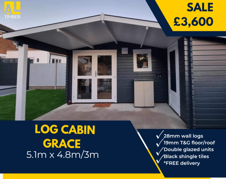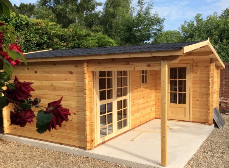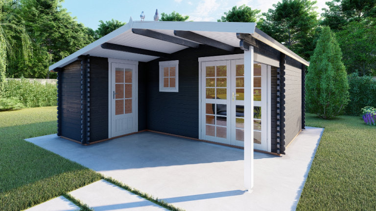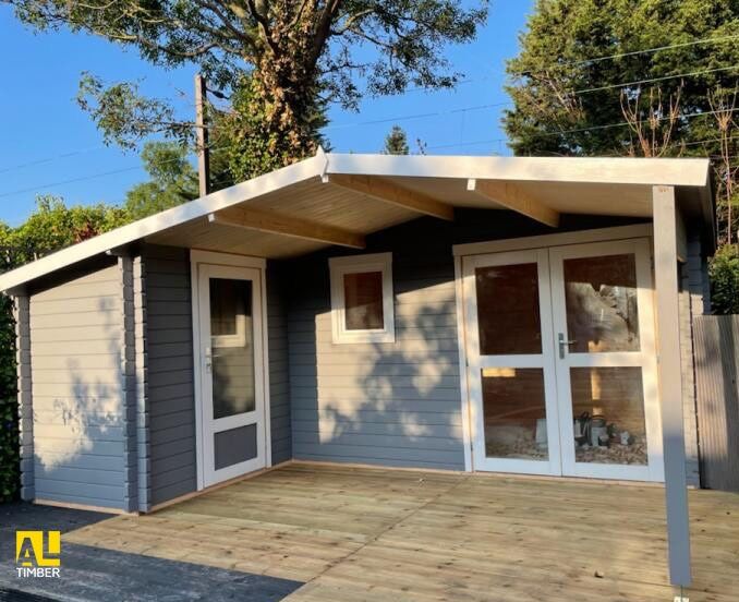 Garden Office Grace 5.1mx4.8/2.98m/ 28mm thick is a perfect outdoor room for use as a garden office/gym studio. Modern and practical. Under 2.5m height. Log Cabin with side annexe for storage.
