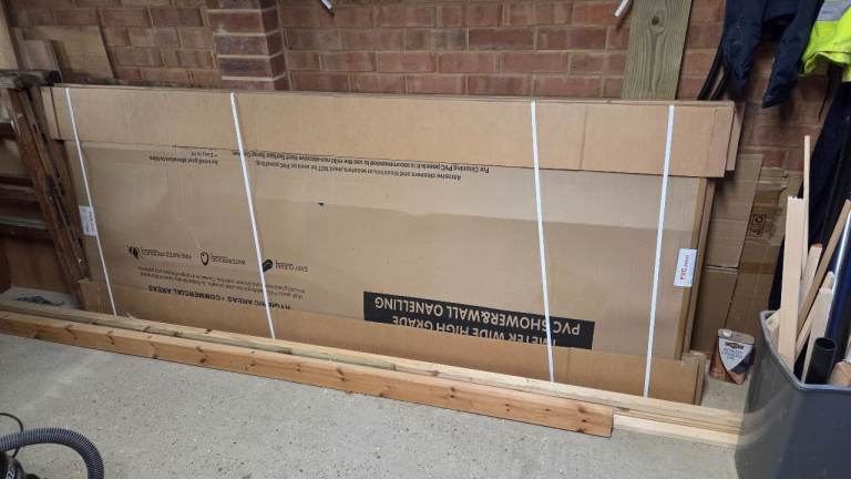 2 panels @ 2400mm x 1000mm x 10mm each, enough to panel out a corner/quadrant shower cubicle.