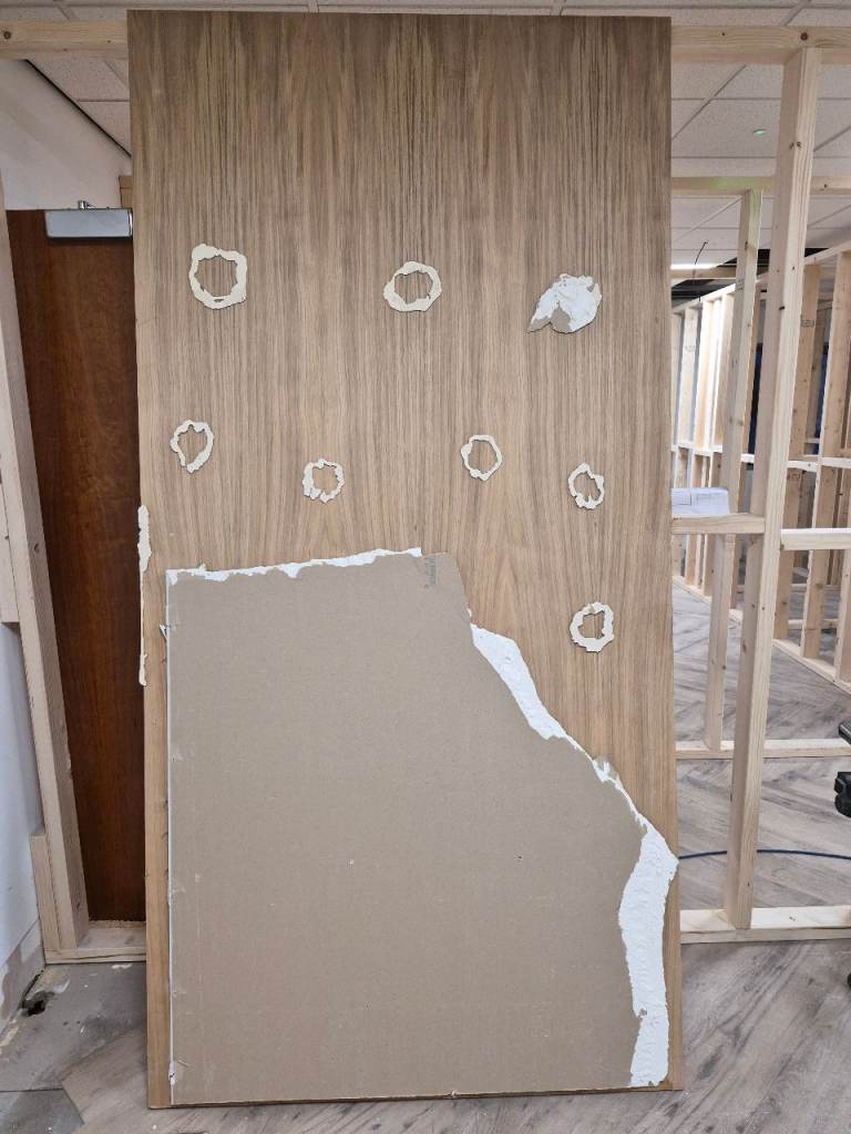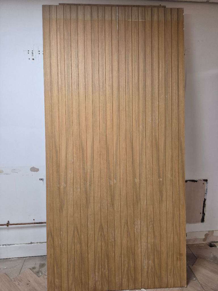 Oak Mdf shèets with grooves in. Ideal for a media wall. Needs the back cleaned off. 2 1/2 sheets avaliable. Pick up only. £30 for the lot!