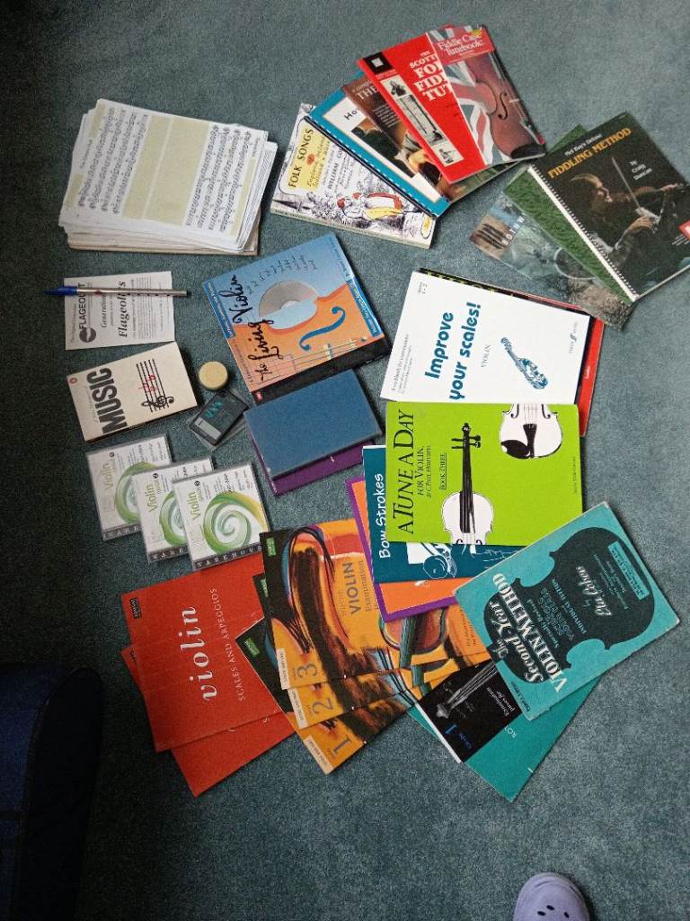 Violin with case in basic good order but needs new strings & a bow. Variety of different music books, portable/collapsible music stand and Seiko digital metronome