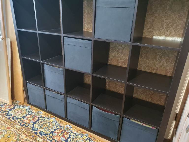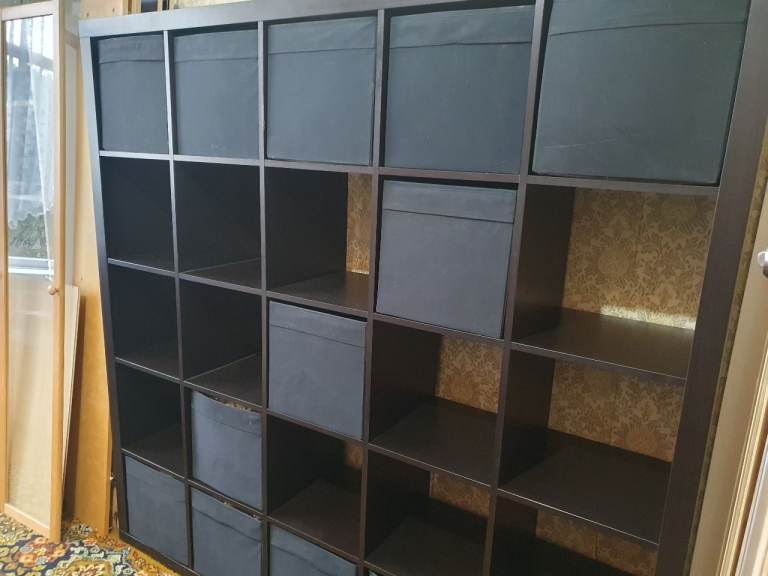 Ikea Kallax brown black 5x5 storage unit shelving with 13 free black boxes