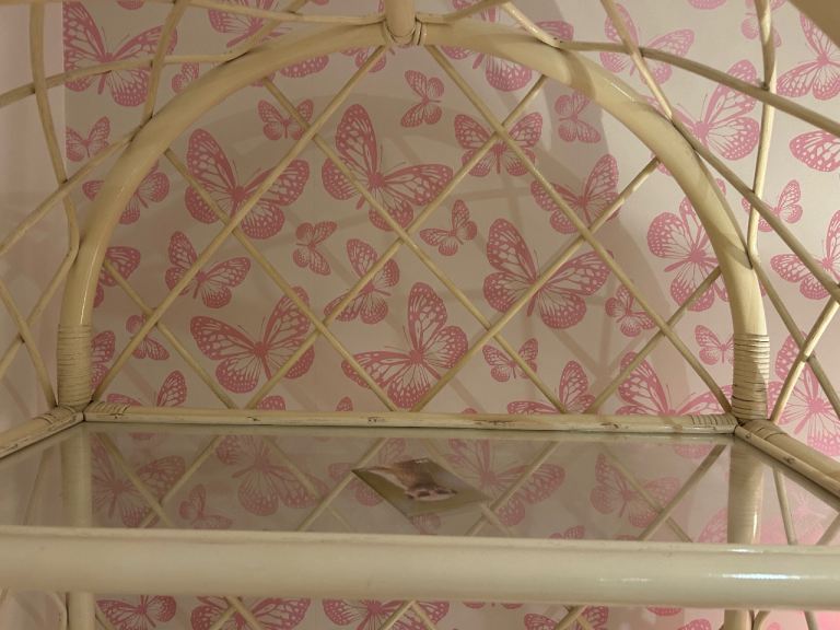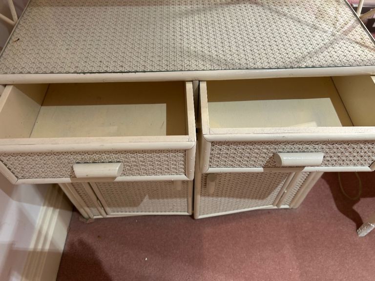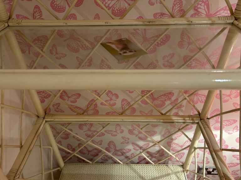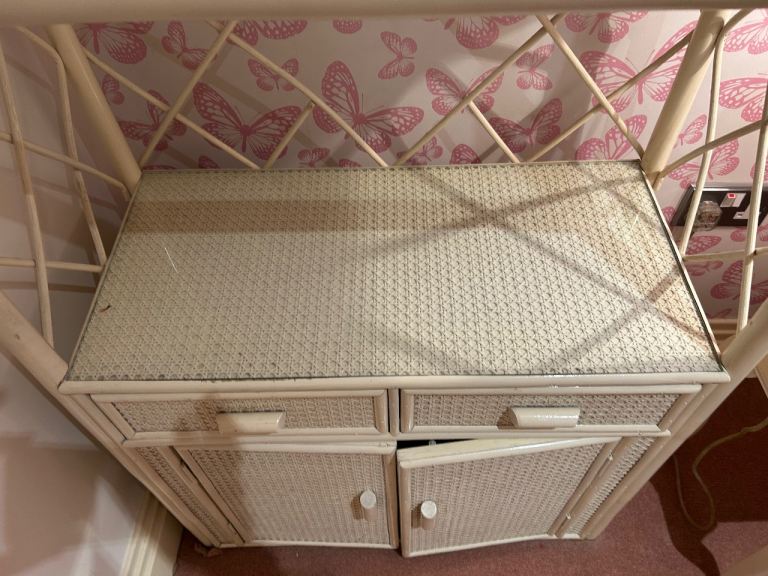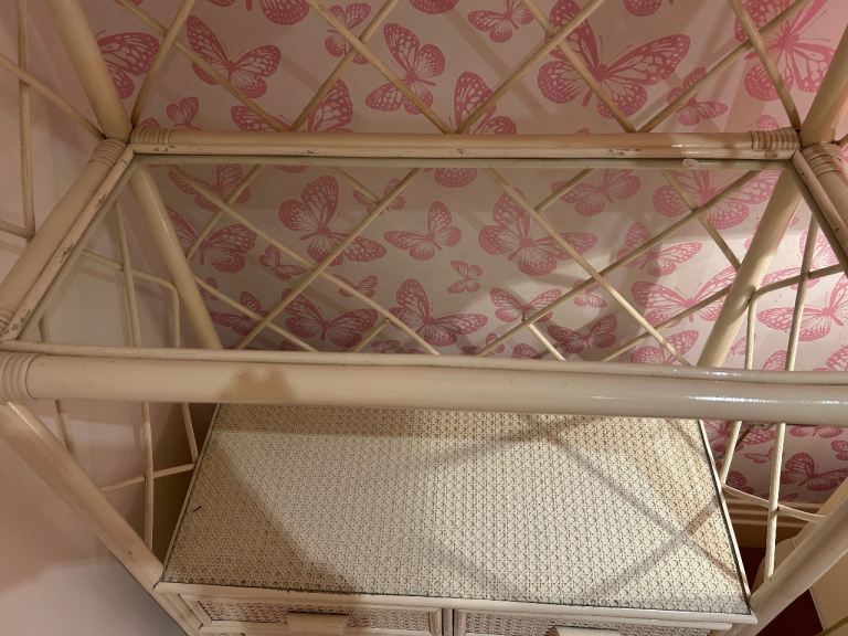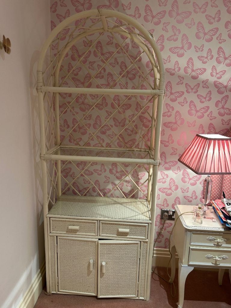 Shabby chic arched shelving unit / etagere wicker and rattan antique white with glass shelves and storage cupboard good condition 74 cm w x 185 cm h x 35 cm collect Stanmore ha7 2qw