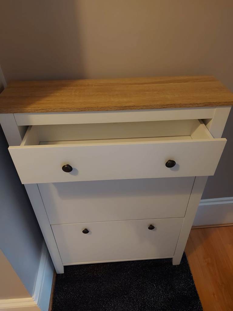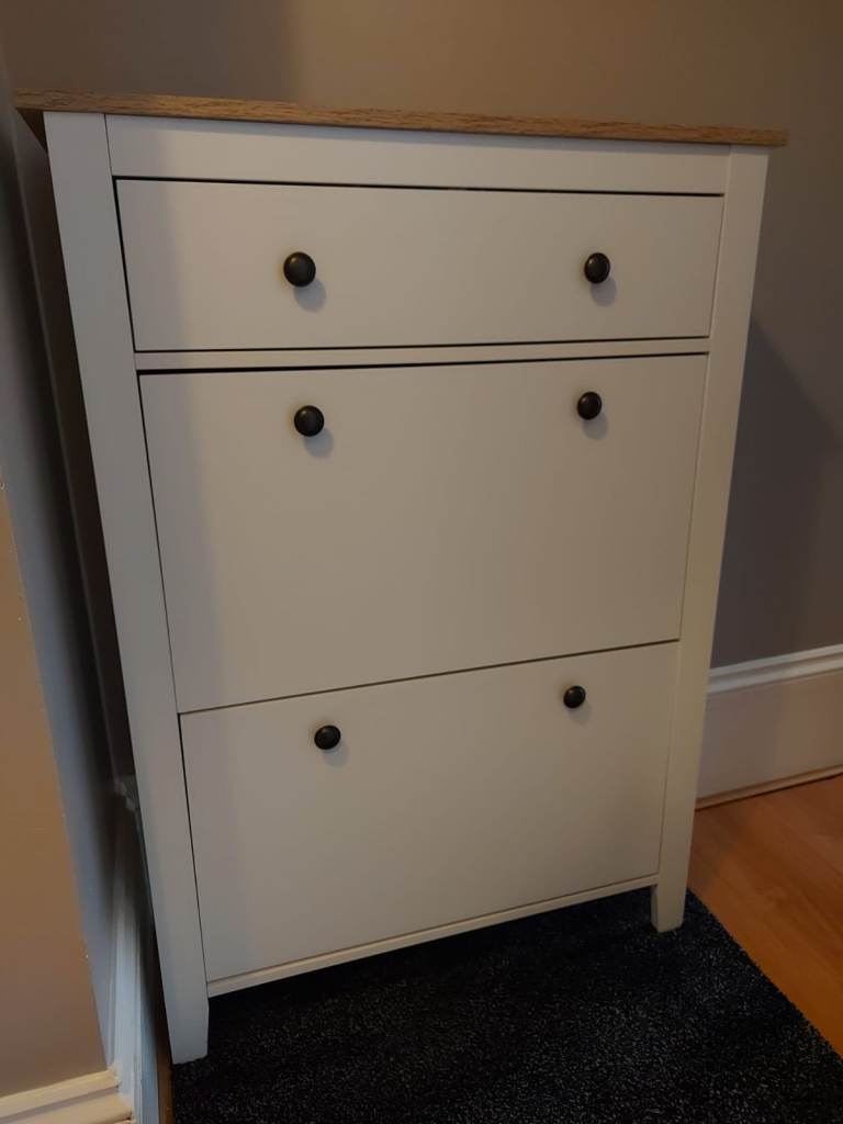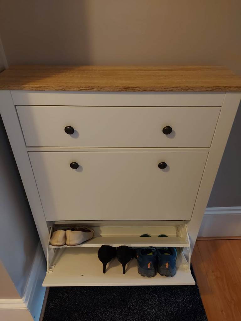 Posting for 5+ yearsWhite Shoe Storage Cabinet with Drawer (Oak Top) – Hallway Unit