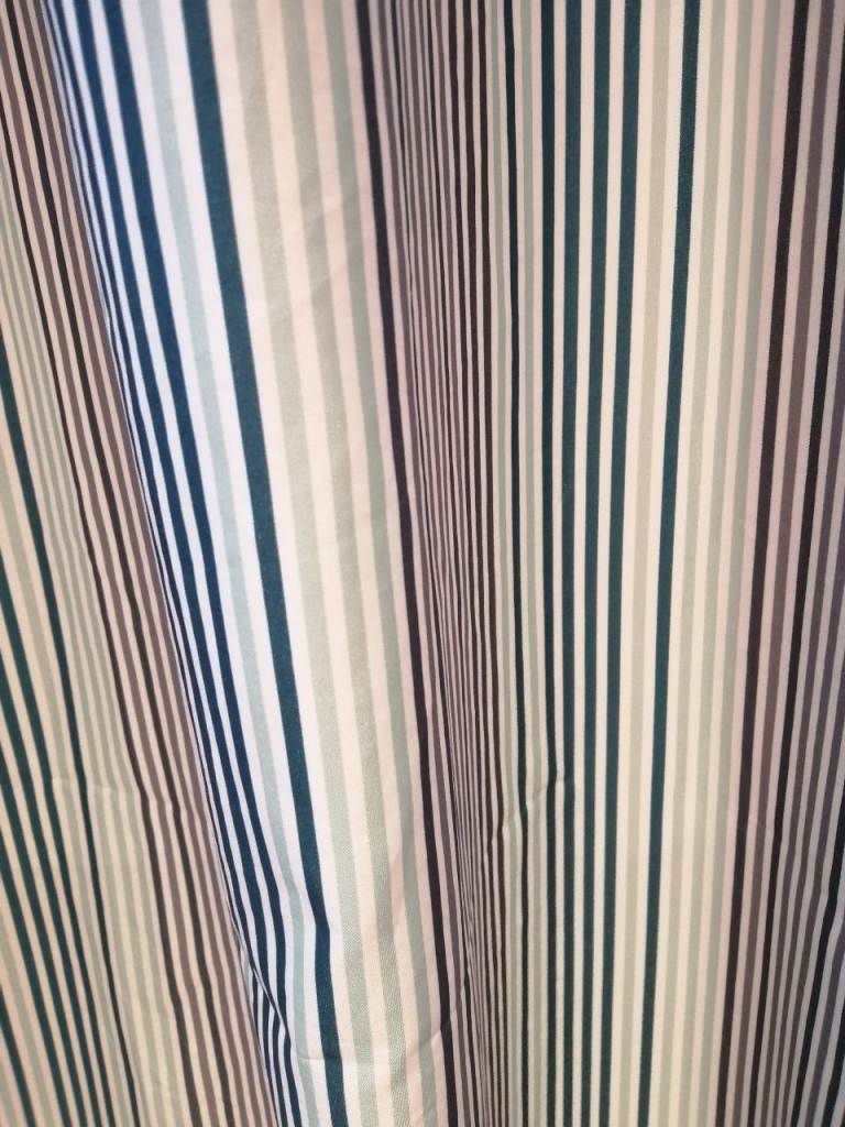 CHROME HALF LENGTH RAIL BLUE STRIP CURTAIN AND CURTAIN HOOKS