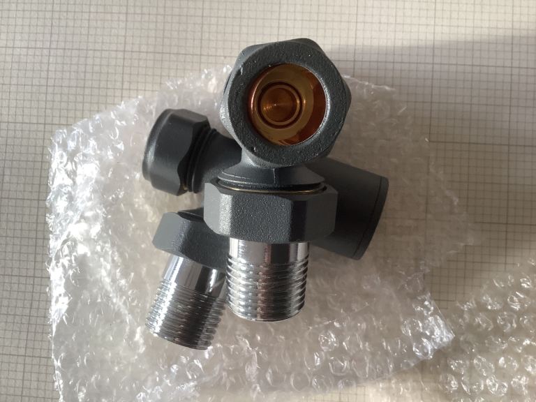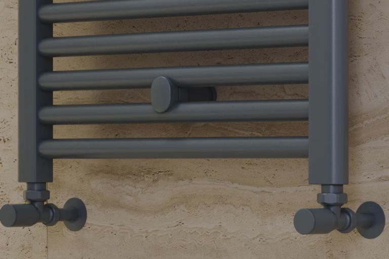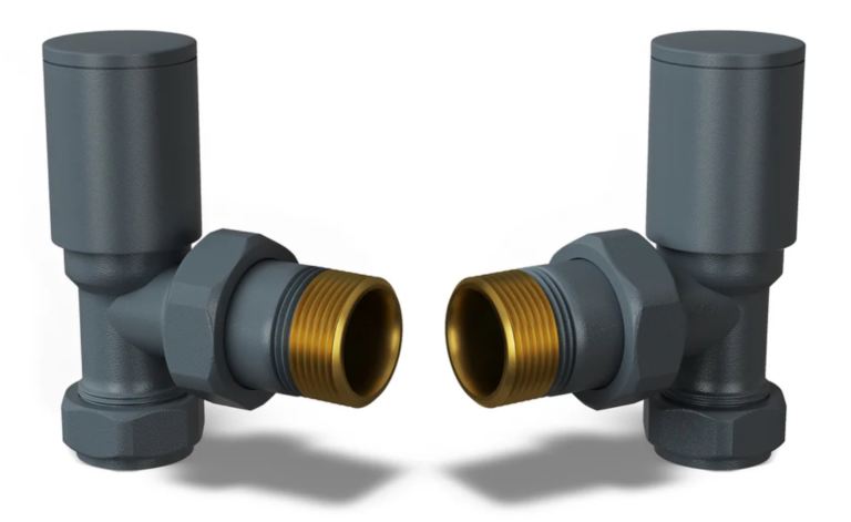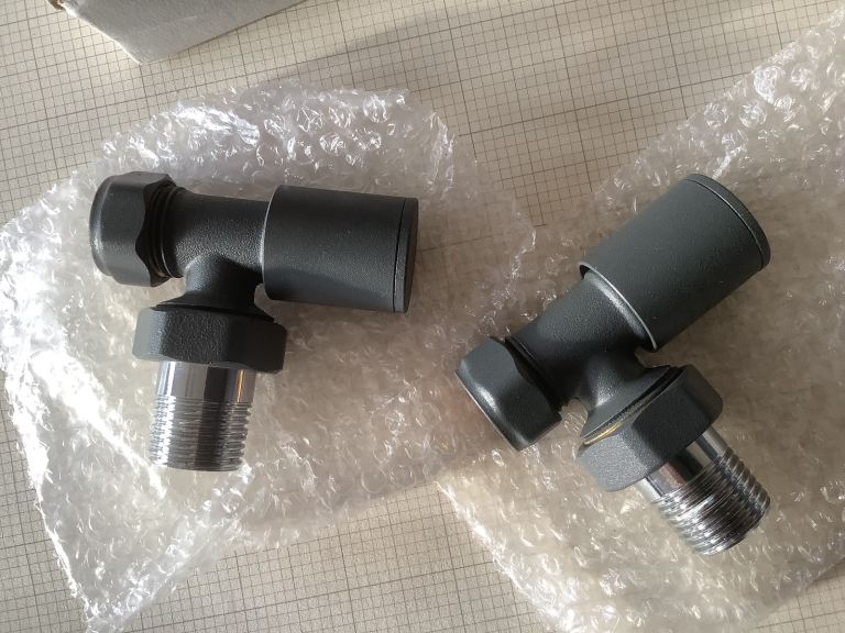 Anthracite brass handled radiator valves 15 mm angled.