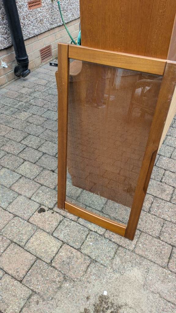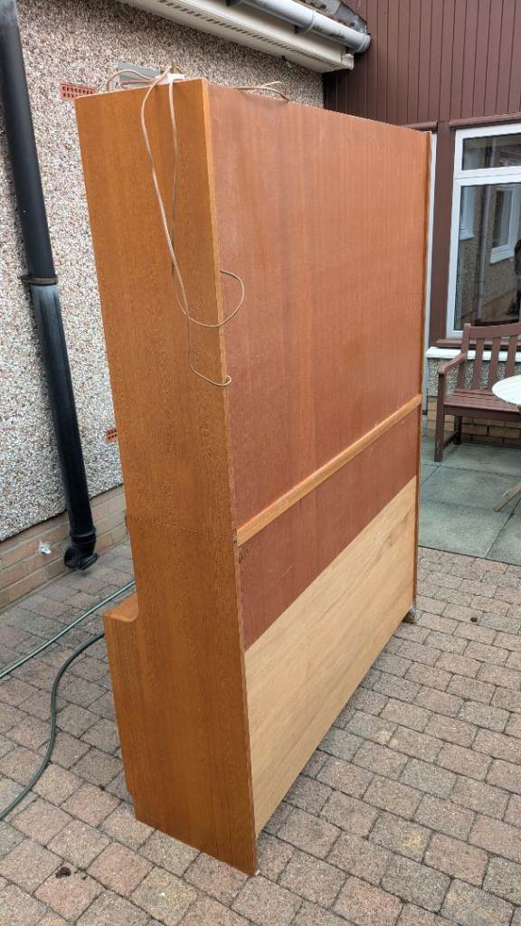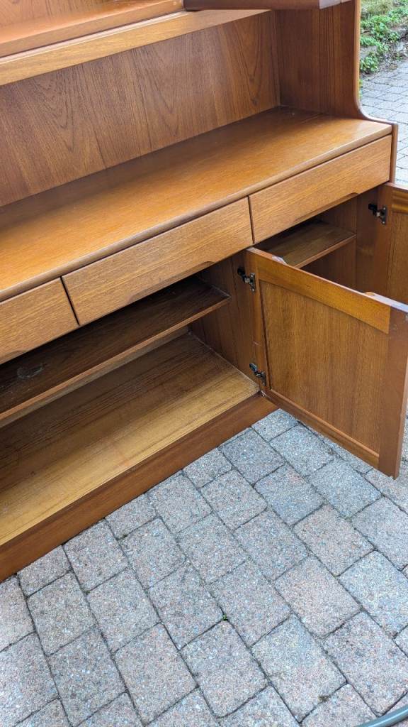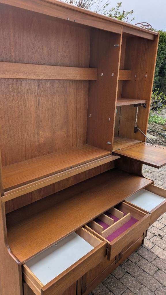 This is a mid century Jentique two tier side board with cutlery drawers and a drinks cabinet, the top tier is backlit with old strip bulbs which sits behind the glass doors (taken off to avoid damage shelves also removed for photos). The drinks cabinet/server is mirror backed and lit as well. Both lighted sections work. It's a great piece, was once upon a time very fashionable. £150 collection only