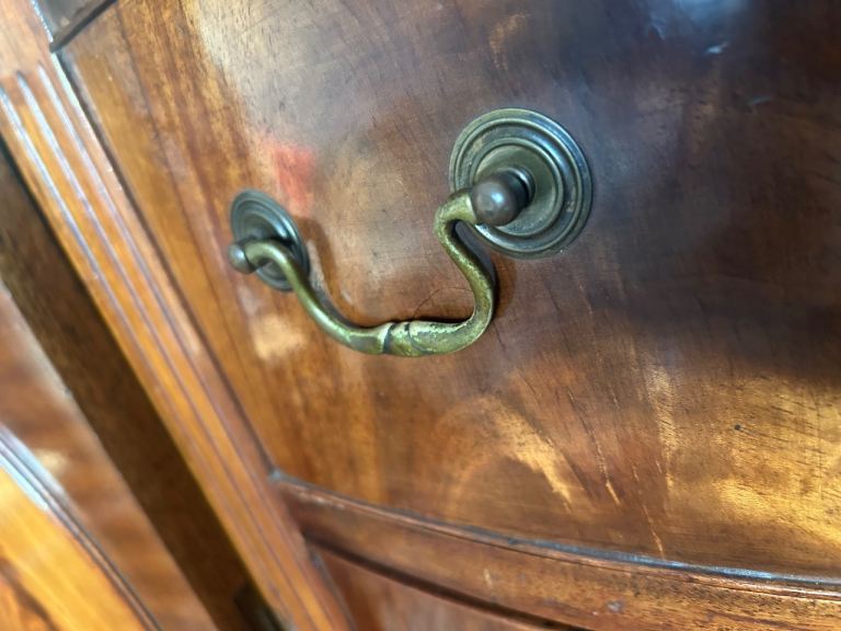 This wonderful antique mahogany shaped front sideboard features a decorative shaped edge to the top with carved detail beneath. The centre has three graduated drawers with beautifully figured mahogany fronts and original brass drop handles, offering both charm and practical storage.