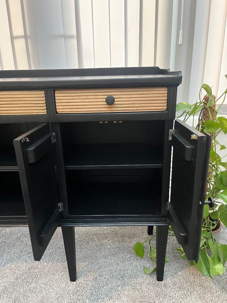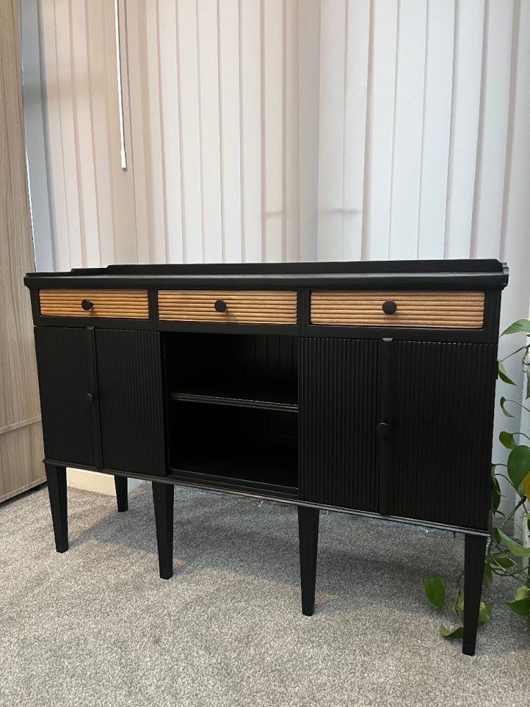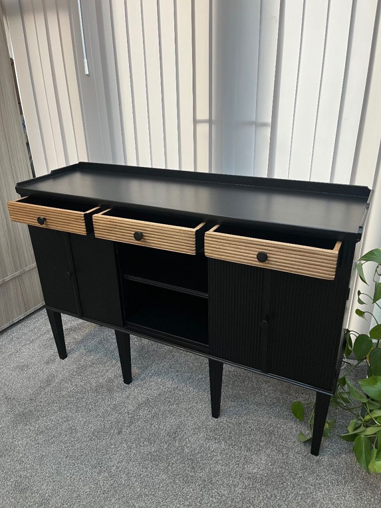 Painted in black satin finish. It has 3 natural wooden fluted drawers, 2 internal cabinets and open shelving in the central section.
