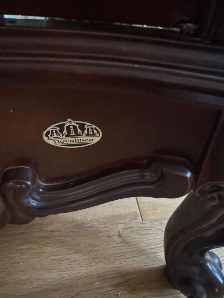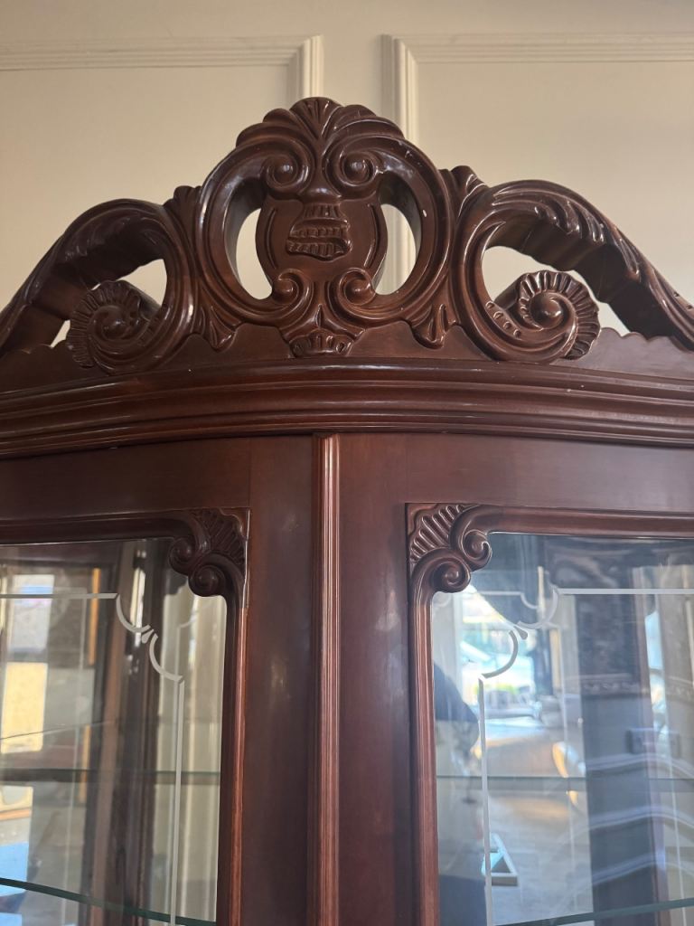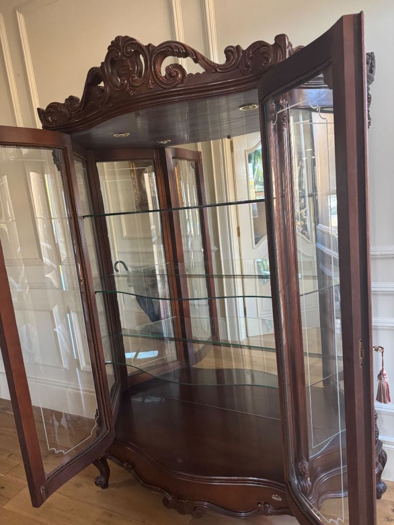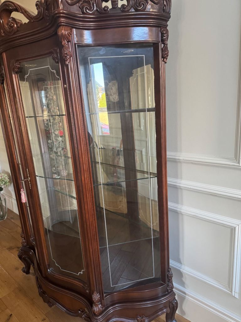 Solid & extremely well kept large display cabinet. Double bevelled front glass doors with mirrored back lit lightening .. fine detailed legs