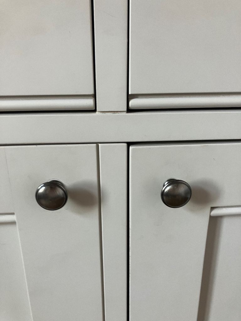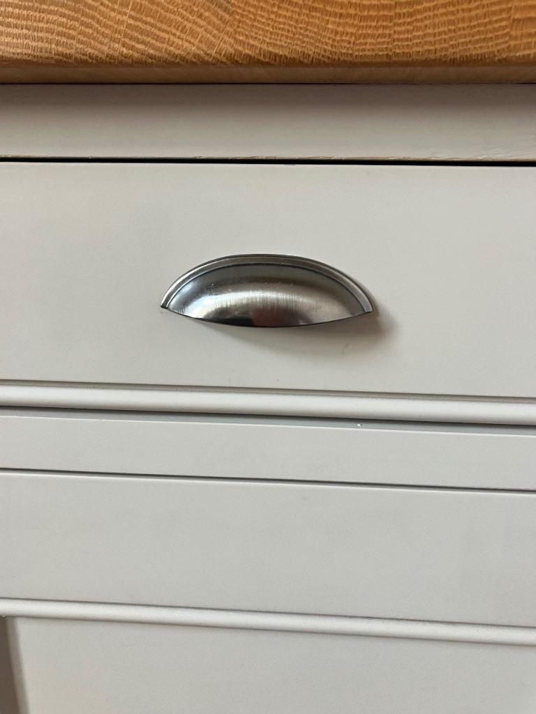 Bottom half - double cupboard and single single cupboard with gun metal pull handles & drawers above with gun metal D shape handles