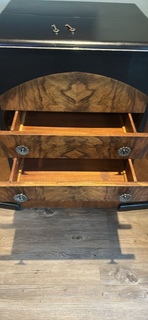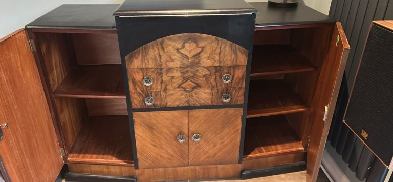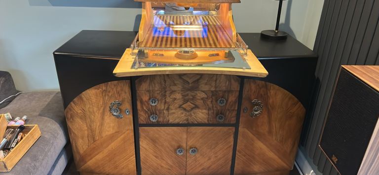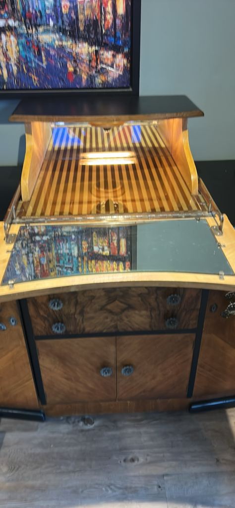 Beautiful art deco style drink cabinet. Comes with original accessories and amazing opening mechanism that lights up.