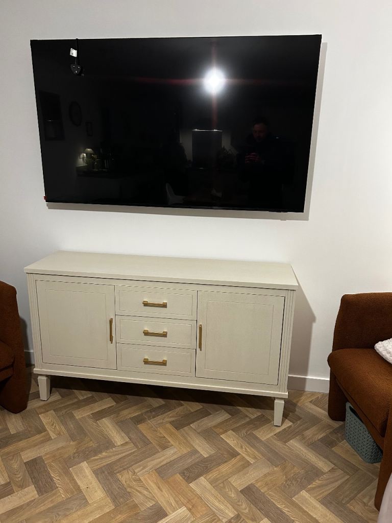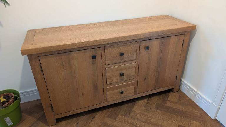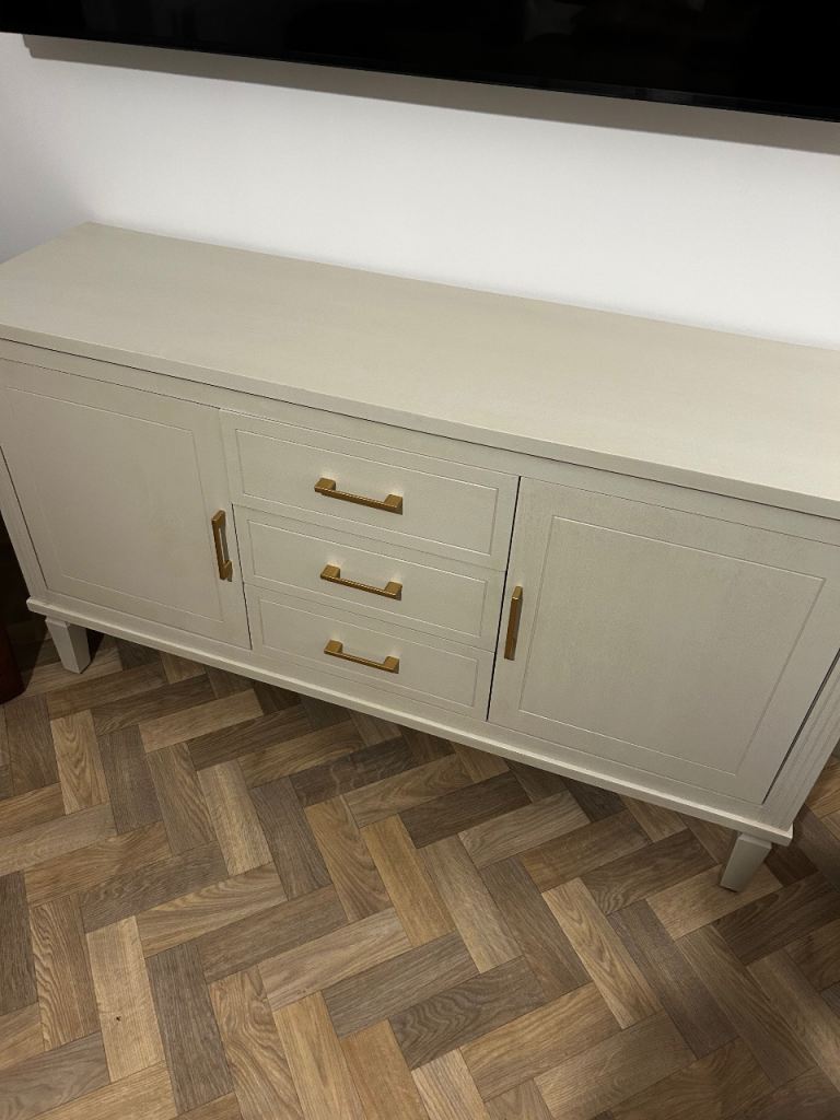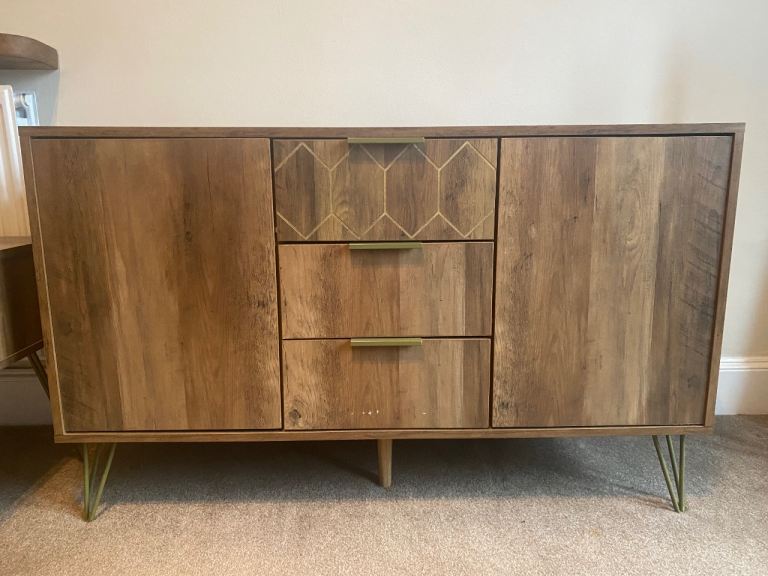 A chic and stylish way to store all of your home essentials, take a look at the Sienna sideboard in natural. Stunning design with a touch of tradition Arriving fully assembled with only the legs to attach, this piece is the perfect combination of traditional style and modern functionality. With a stunning border style design and pillar style feet, it’s crafted with a wood veneer finish in a warm natural tone. It also has brushed gold-effect rectangular handles, creating a soft and subtle colour contrast. Durable and built to last, the Sienna Sideboard comprises 3 drawers with metal runners and 2 side cabinets, both of which provide ample space for everything from your keys and Kindle to your books and magazines. To complete the look, explore the entire Sienna living room furniture collection which includes: 140cm TV Stand 2 Door / 3 Drawer Sideboard Console Table Our Sienna furniture is perfectly pairs it with the Chesterfield Sofa Collection. DUSK Sienna Sideboard With Drawers - Na