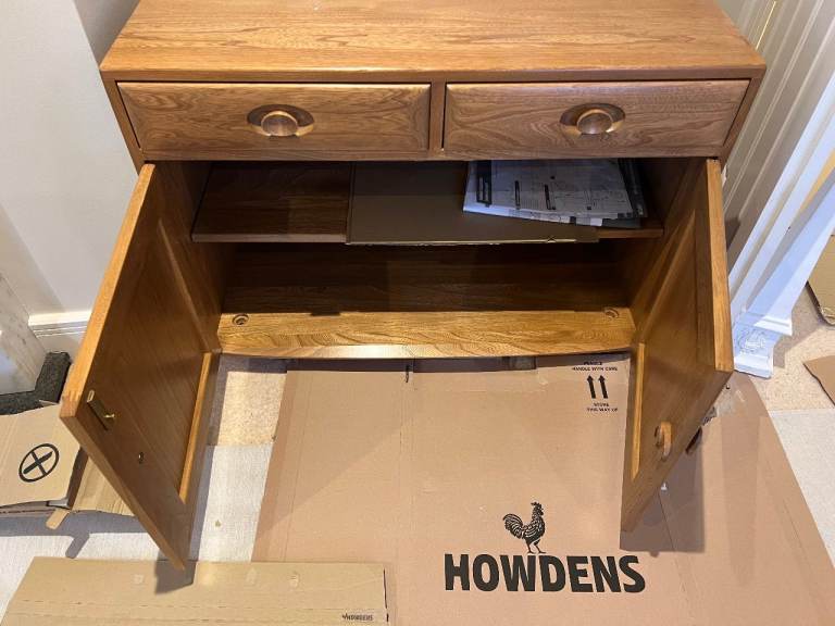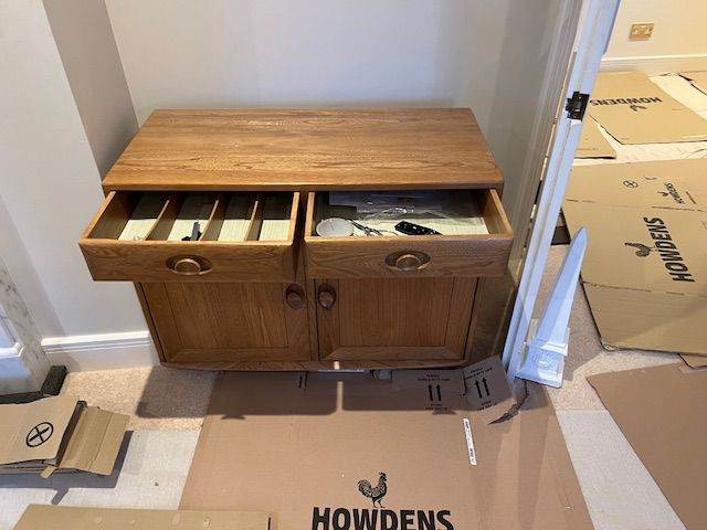 FOR SALE: Ercol Windsor sideboard cabinet in light ash. The cabinet has two drawers at the top - one with a matching cutlery tray. At the bottom is a two door cupboard with one full length wooden shelf. Approximate size is 68cm high x 91 cm long x 43cm wide. The cabinet costs £2,900 new and is like new. Smoke free & pet free home. Buyer collects Weybridge.
