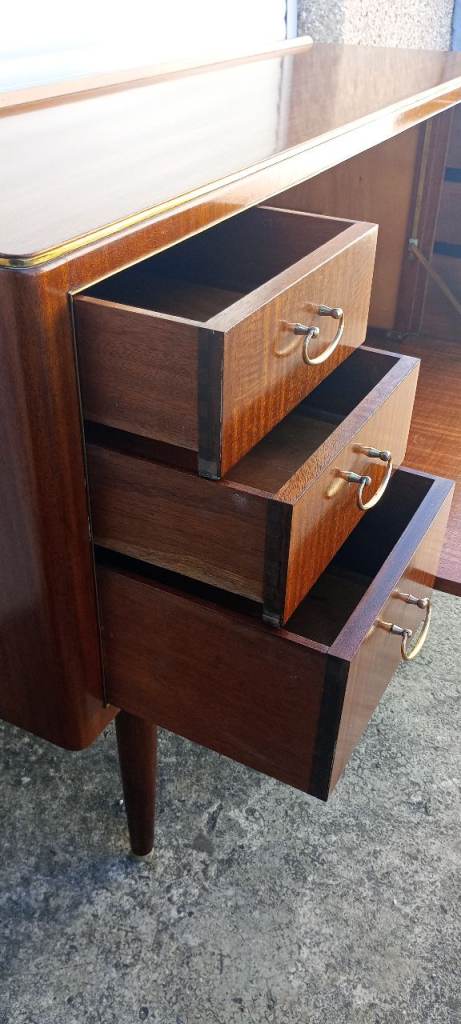 A 1950s Greaves and Thomas sideboard. A stunning piece with superb quality and craftsmanship throughout. The grain is vibrant and figurative with original aged patina and book matched grain. This rare sideboard has some lovely features with curved corners to the front and back and inlaid brass detail and handles. The sideboard sits on round tapering legs and brass capped feet. The pull down cabinet has the key to open and close the door, the lock doesn't work but door shuts tight and has a ball catch. It's strong and sturdy with all doors and drawers opening and closing smoothly. The condition is good with some signs of wear and use commensurate with age please see pictures provided.