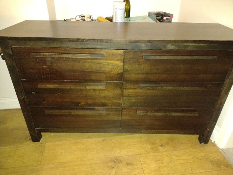 Wooden John Lewis Maharani style sideboard with drawers (need loosening) and cupboard.
