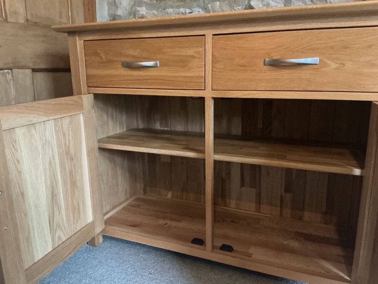 Solid oak internal shelves to both cupboards ( adjustable), dovetail joints, solid T&G back and drawer bases.