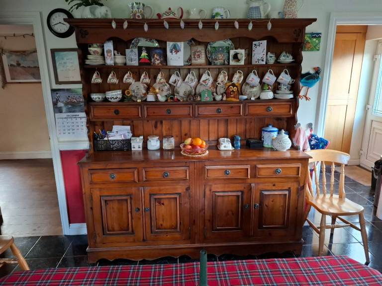 Lovely large dark pine dresser. Two double doored cupboards and four drawers in base unit with four mini drawers in upper section