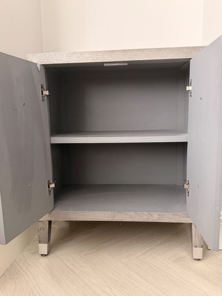 Beautiful Mirrored cupboard. Two doors which open and there is one shelf inside. The cabinet is grey wood with double mirrored doors on the front.