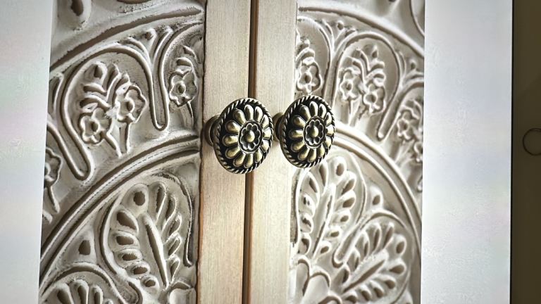 This beautiful sideboard features intricate carved details and a lovely whitewashed finish, perfect for living or dining areas.