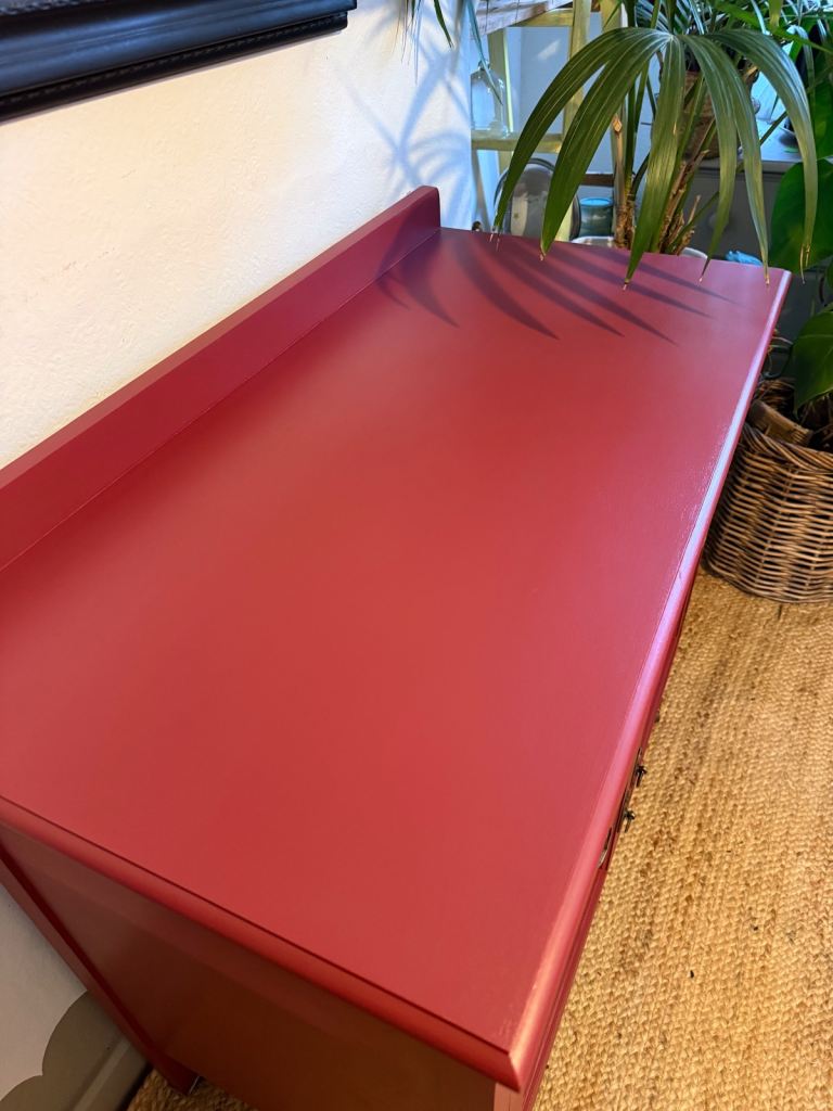 Newly refurbished antique cabinet painted in Riad Red by frenchic and original hardware restored.